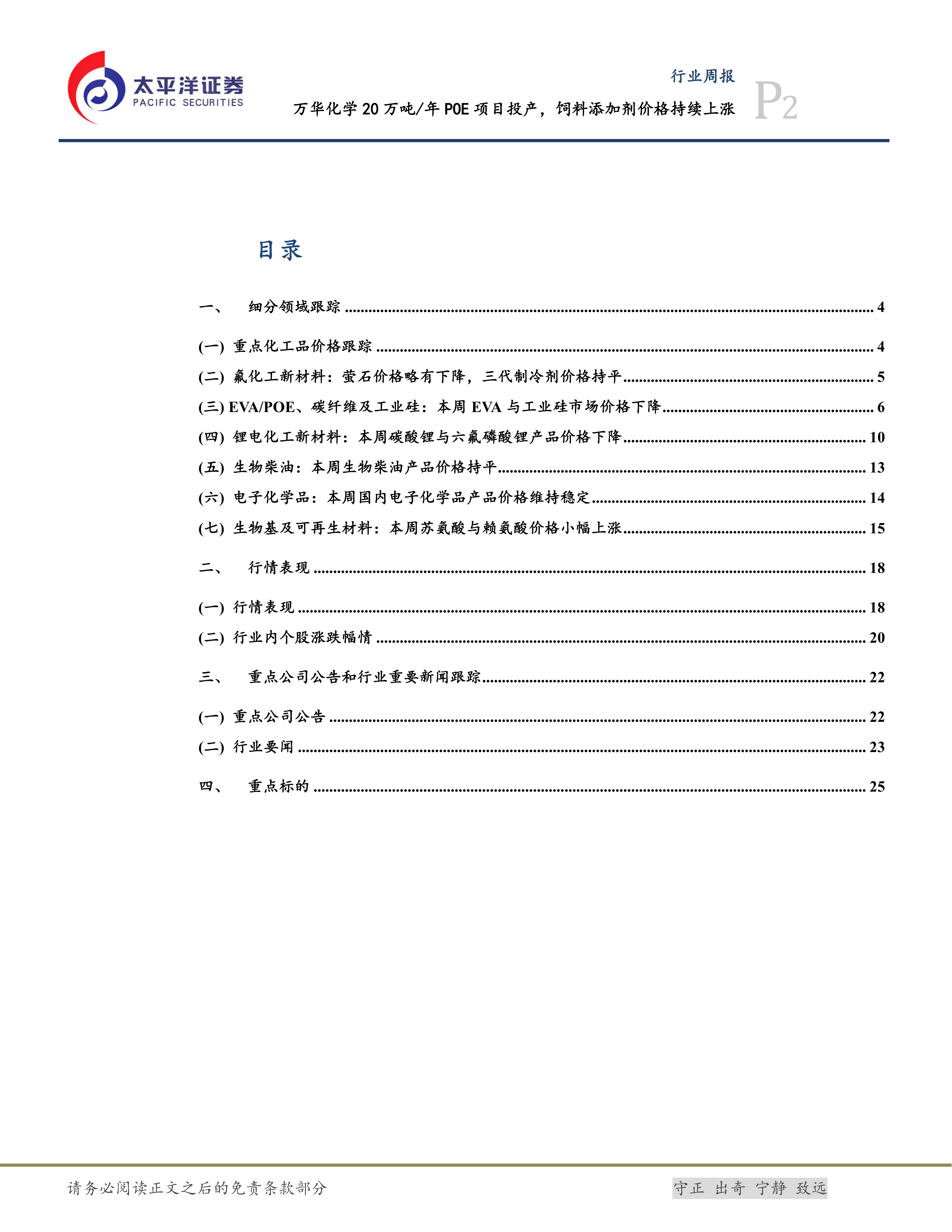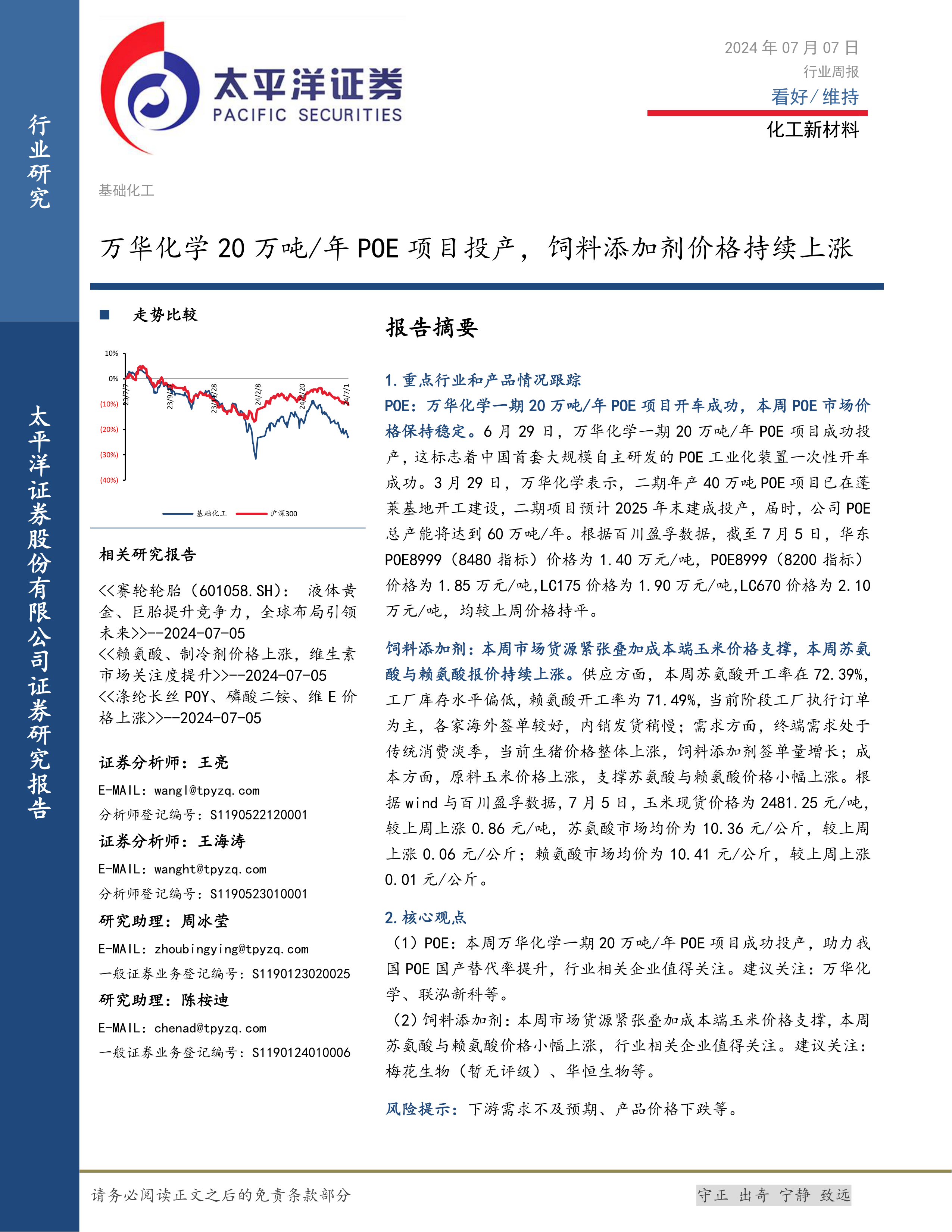 化工新材料行业周报:万华化学20万吨/年POE项目投产,饲料添加剂价格持续上涨