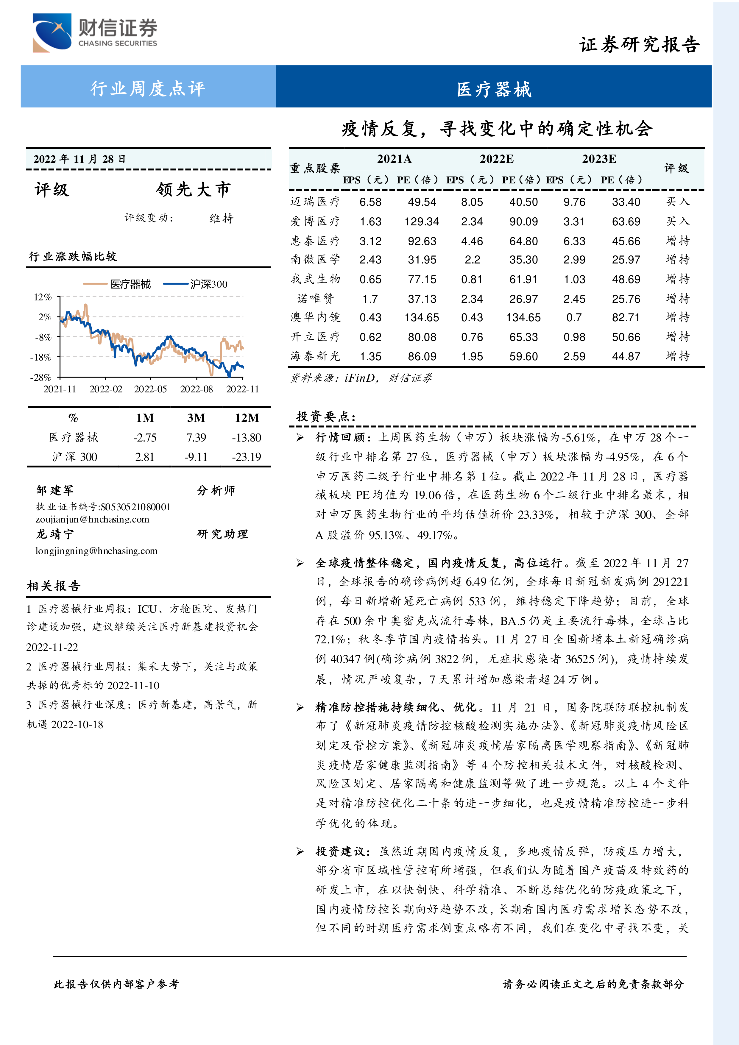 本报告分析了医疗器械行业的市场表现、疫情数据,并提出了投资建议。 报告指出,虽然国内疫情反复,但随着精准防控措施的优化和国产疫苗及特效药的研发上市,医疗器械行业仍存在确定性机会。 建议投资者短期关注新冠检测和诊疗设备相关公司,中长期关注医疗新基建和消费医疗复苏,并关注具备自主创新能力的研发平台化厂家和消费医疗企业。 同时,报告也提示了海内外疫情加剧、集采政策变化等风险。