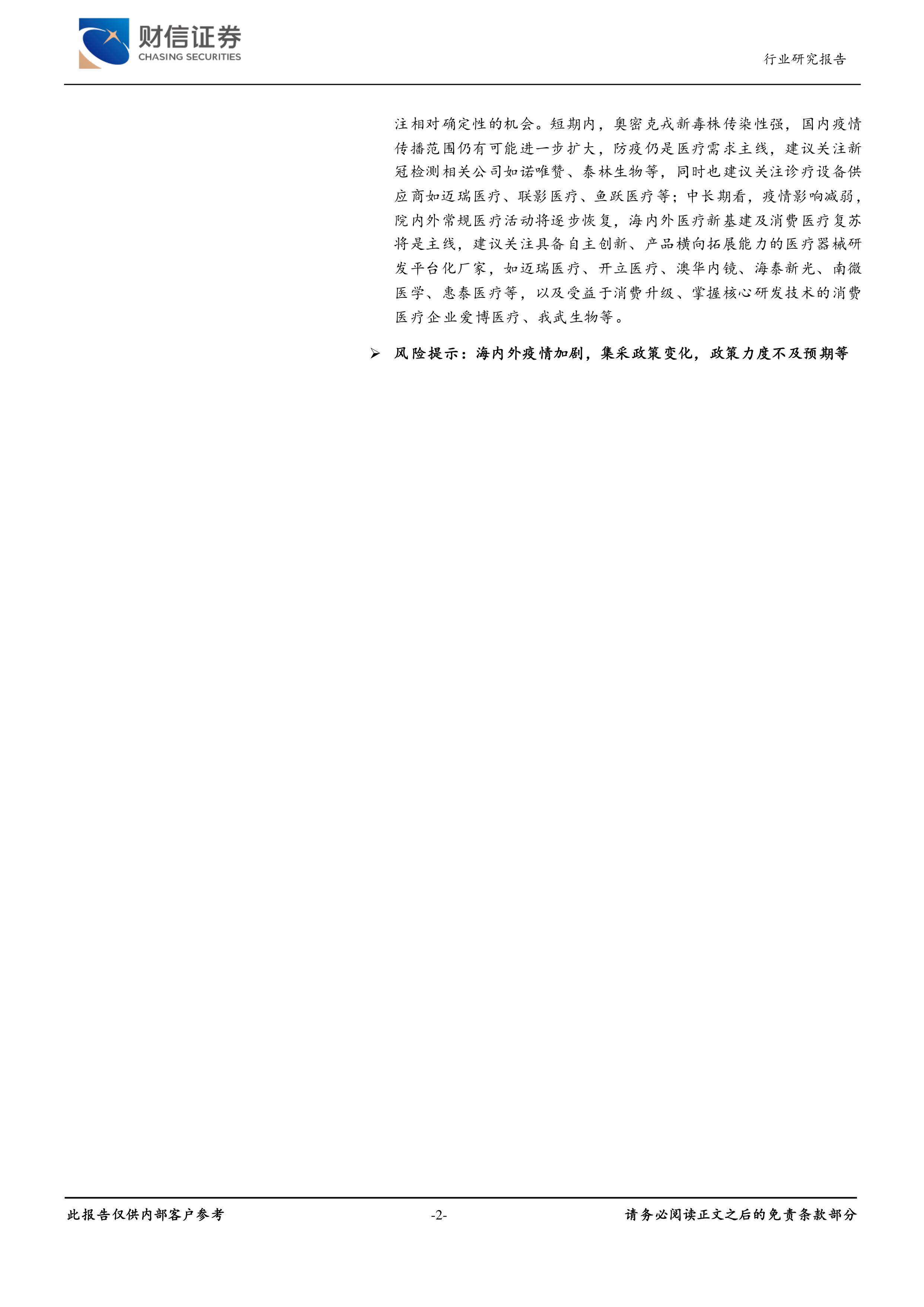 投资建议:虽然近期国内疫情反复,多地疫情反弹,防疫压力增大,部分省市区域性管控有所增强,但我们认为随着国产疫苗及特效药的研发上市,在以快制快、科学精准、不断总结优化的防疫政策之下,国内疫情防控长期向好趋势不改,长期看国内医疗需求增长态势不改,但不同的时期医疗需求侧重点略有不同,我们在变化中寻找不变,关注相对确定性的机会。短期内,奥密克戎新毒株传染性强,国内疫情传播范围仍有可能进一步扩大,防疫仍是医疗需求主线,建议关注新冠检测相关公司如诺唯赞、泰林生物等,同时也建议关注诊疗设备供应商如迈瑞医疗、联影医疗、鱼跃医疗等;中长期看,疫情影响减弱,院内外常规医疗活动将逐步恢复,海内外医疗新基建及消费医疗复苏将是主线,建议关注具备自主创新、产品横向拓展能力的医疗器械研发平台化厂家,如迈瑞医疗、开立医疗、澳华内镜、海泰新光、南微医学、惠泰医疗等,以及受益于消费升级、掌握核心研发技术的消费医疗企业爱博医疗、我武生物等。