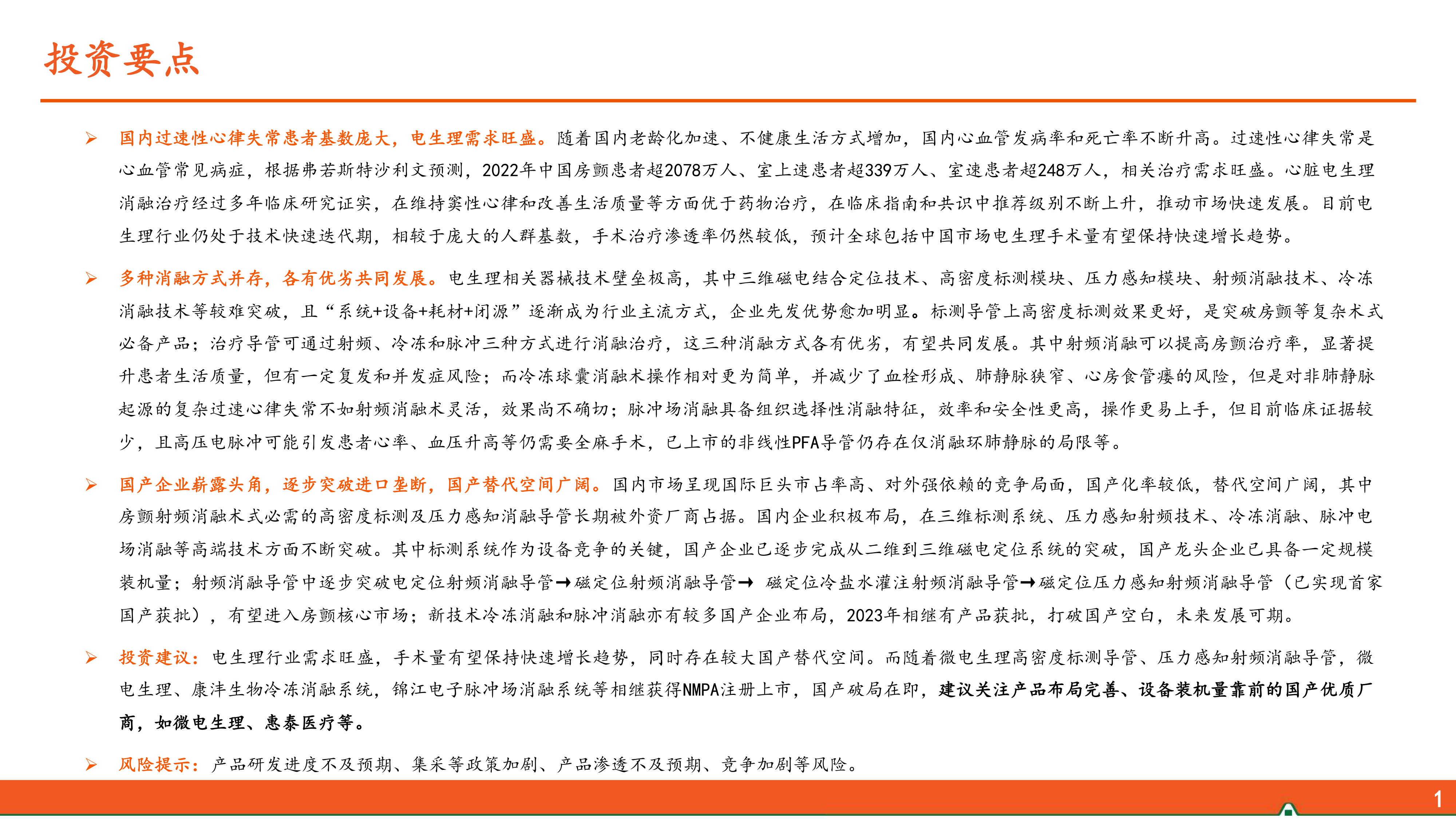 本报告深入分析了电生理行业的市场前景、技术发展、竞争格局和投资建议。 随着国内老龄化加速、心血管疾病发病率上升,电生理治疗需求旺盛,市场潜力巨大。 多种消融方式并存,技术不断迭代,为行业发展提供了持续动力。 国产企业在三维标测系统、耗材等领域积极布局,有望逐步实现进口替代。 建议关注产品布局完善、设备装机量靠前的国产优质厂商,把握行业发展机遇。 风险提示包括产品研发、政策、市场竞争等。