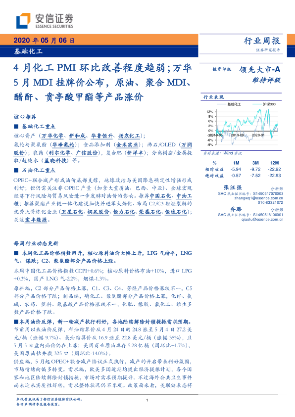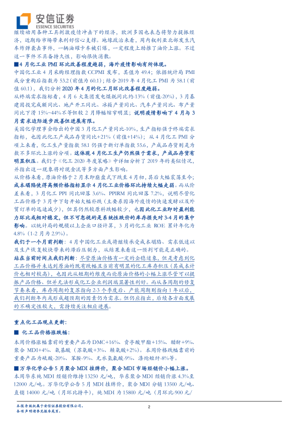 本报告分析了2020年5月6日的基础化工行业周报,核心观点包括:4月化工PMI环比改善程度趋弱,油价反弹,MDI价格分化,以及部分化工品价格上涨。报告详细分析了行业动态、价格变动、重点产品,并提示了相关风险。 报告建议关注MDI、氨基酸、醋酐、DMC、贲亭酸甲酯等产品的价格变动,并密切关注疫情、油价、下游需求等因素对行业的影响。