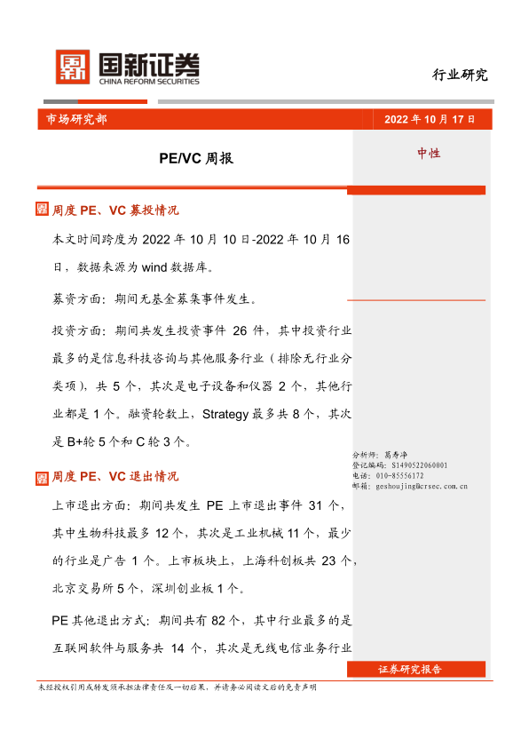 本周(2022年10月10日至2022年10月16日)PE/VC市场呈现出募资停滞、投资活跃度有所下降、退出事件增加的特点。报告期内无基金募集事件发生,投资事件共26件,退出事件显著增加,其中上市退出31个,其他退出方式82个。