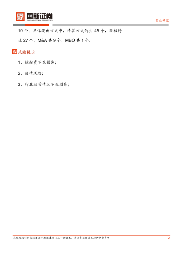 报告提示了投融资不及预期、疫情风险、行业经营情况不及预期等风险。