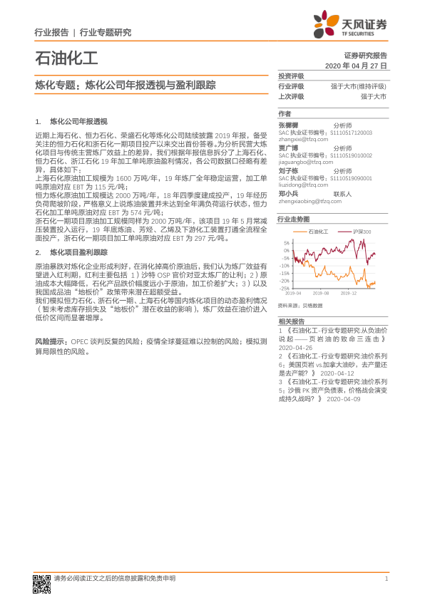 报告模拟了恒力石化、浙石化一期、上海石化等国内炼化项目的动态盈利情况,并展示了炼厂效益在油价进入低价区间而显著增厚。