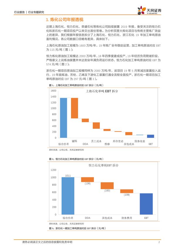 报告分析了上海石化、恒力石化、浙石化一期三家炼化公司2019年的加工单吨原油盈利情况,并进行了对比分析: