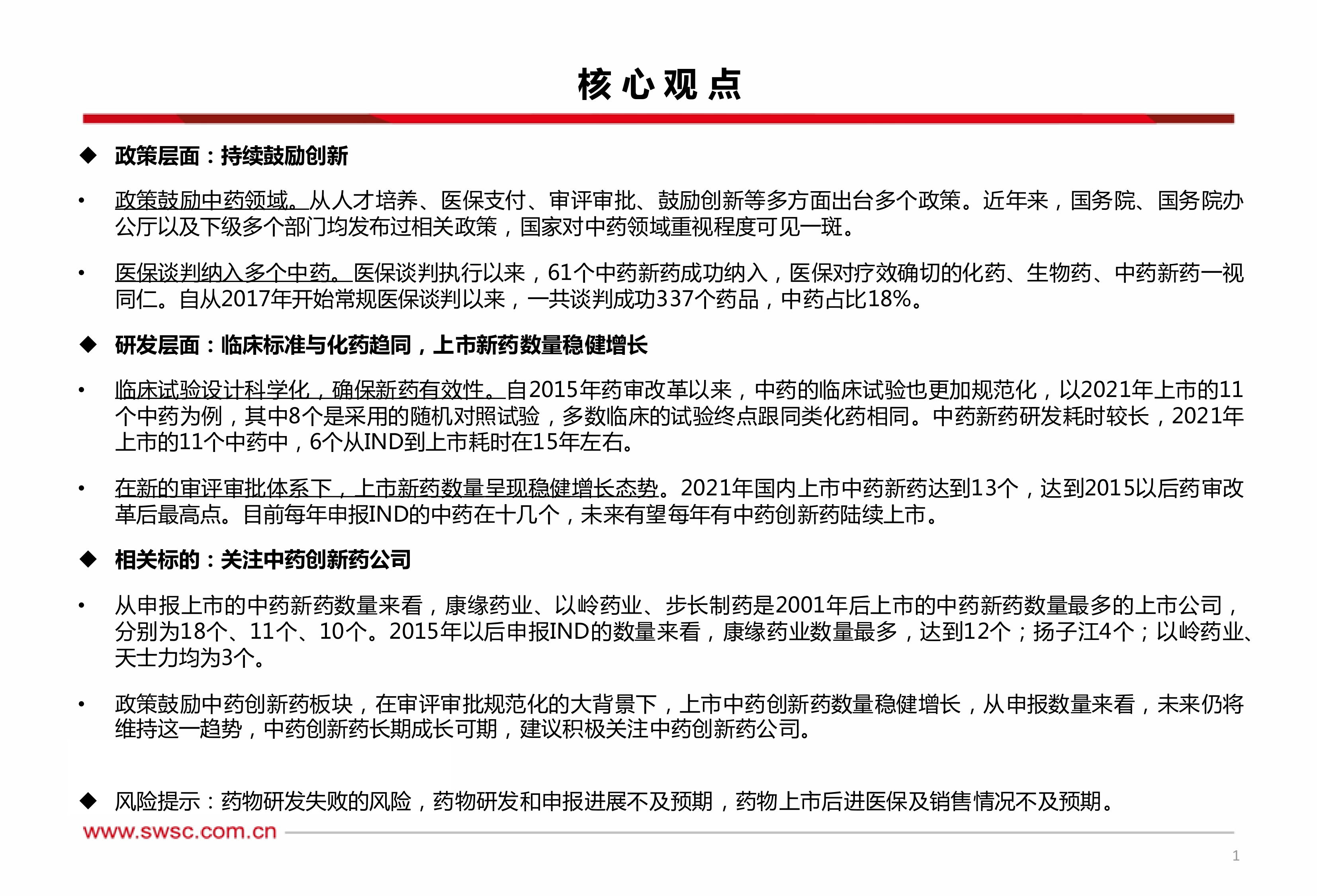 本报告深入分析了中药创新药行业的政策环境、研发进展、市场表现和重点企业。 报告指出,国家政策的大力支持、研发规范化的推进以及新药上市数量的稳步增长,共同构成了中药创新药行业长期向好的发展趋势。 报告建议投资者关注在中药创新药领域具有优势的企业,并提示了药物研发失败、申报进展不及预期、上市后销售不及预期等风险。 总体而言,中药创新药行业具备良好的发展前景,值得投资者关注。