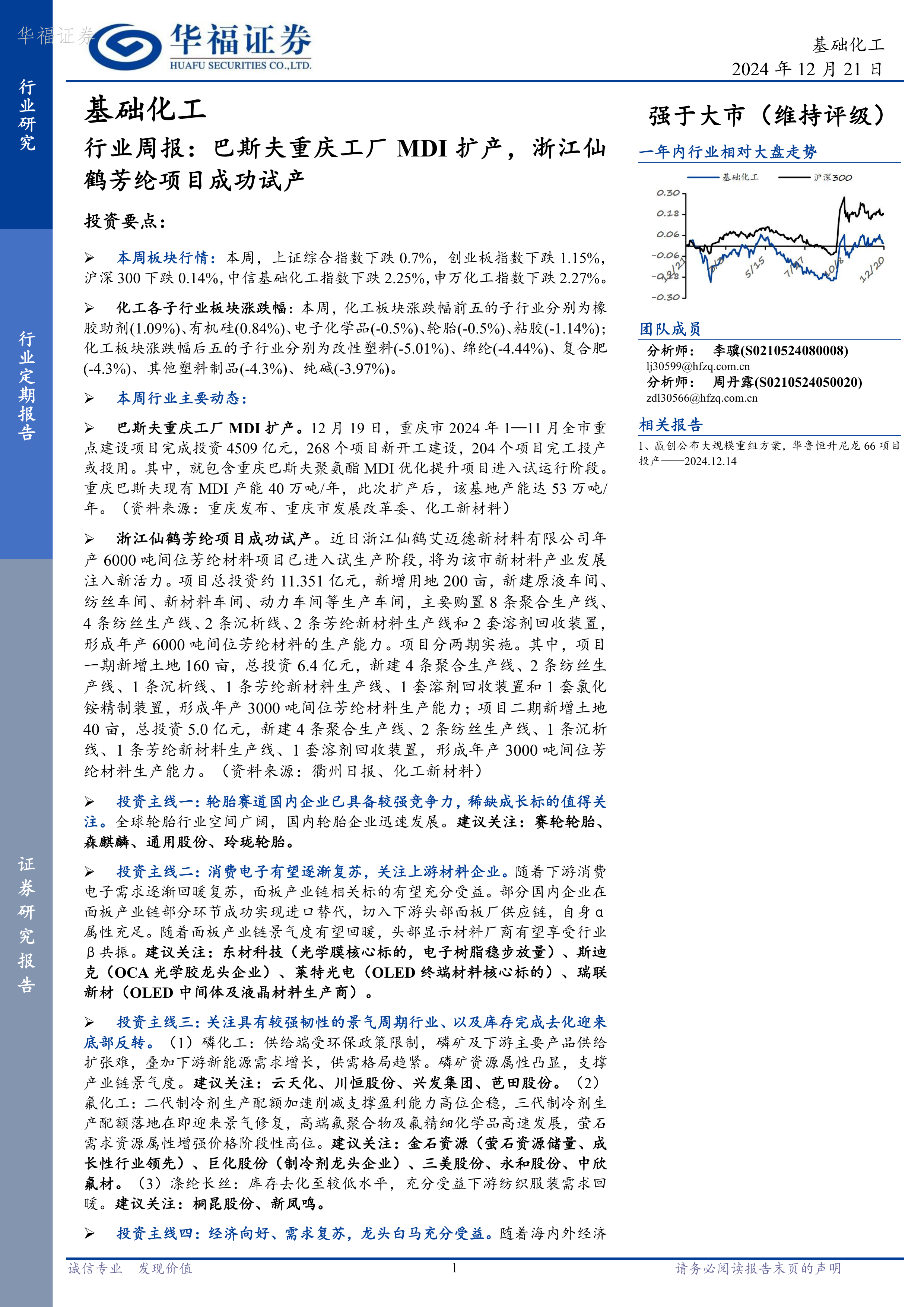 报告关注了巴斯夫重庆工厂MDI扩产、浙江仙鹤芳纶项目试产等行业动态,并对轮胎、消费电子、周期性行业、龙头白马及维生素等细分领域进行了投资建议。