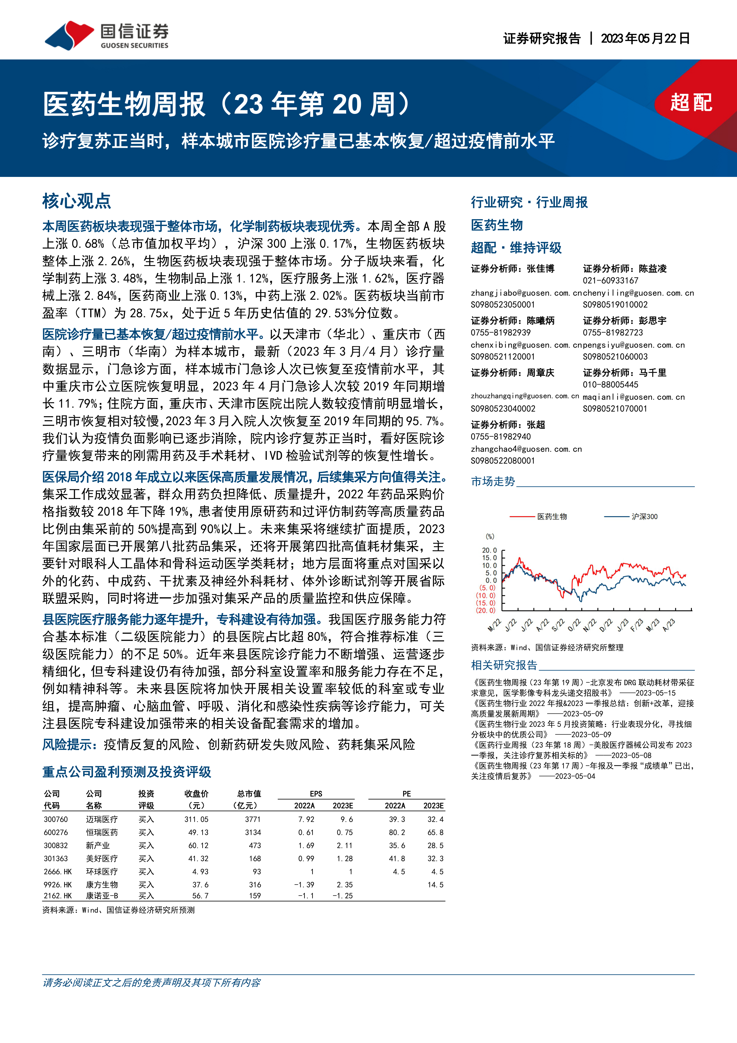 医药生物周报(23年第20周):诊疗复苏正当时,样本城市医院诊疗量已基本恢复/超过疫情前水平
