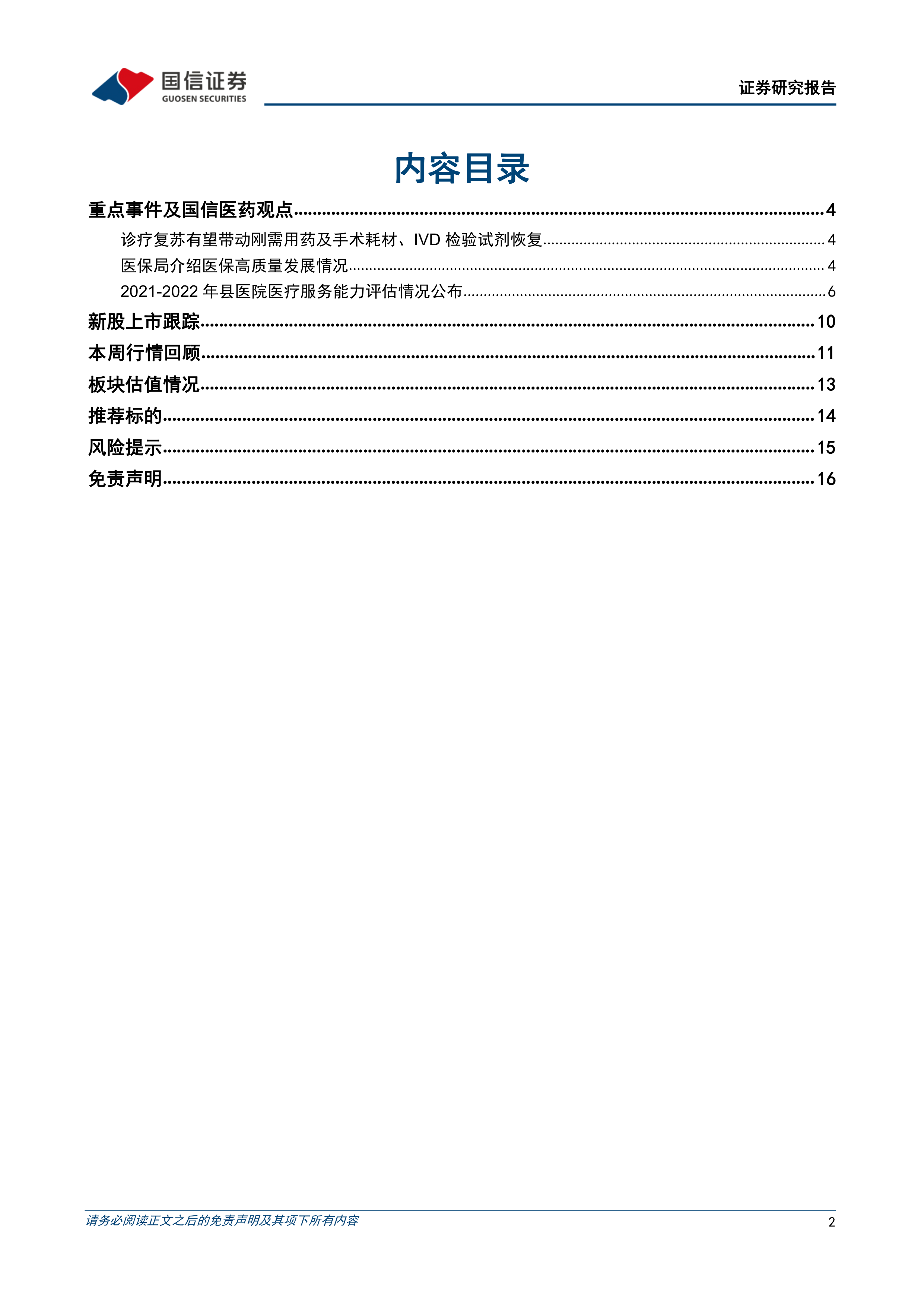 报告认为,疫情负面影响已逐步消除,院内诊疗复苏正当时,看好医院诊疗量恢复带来的刚需用药及手术耗材、IVD 检验试剂等的恢复性增长。