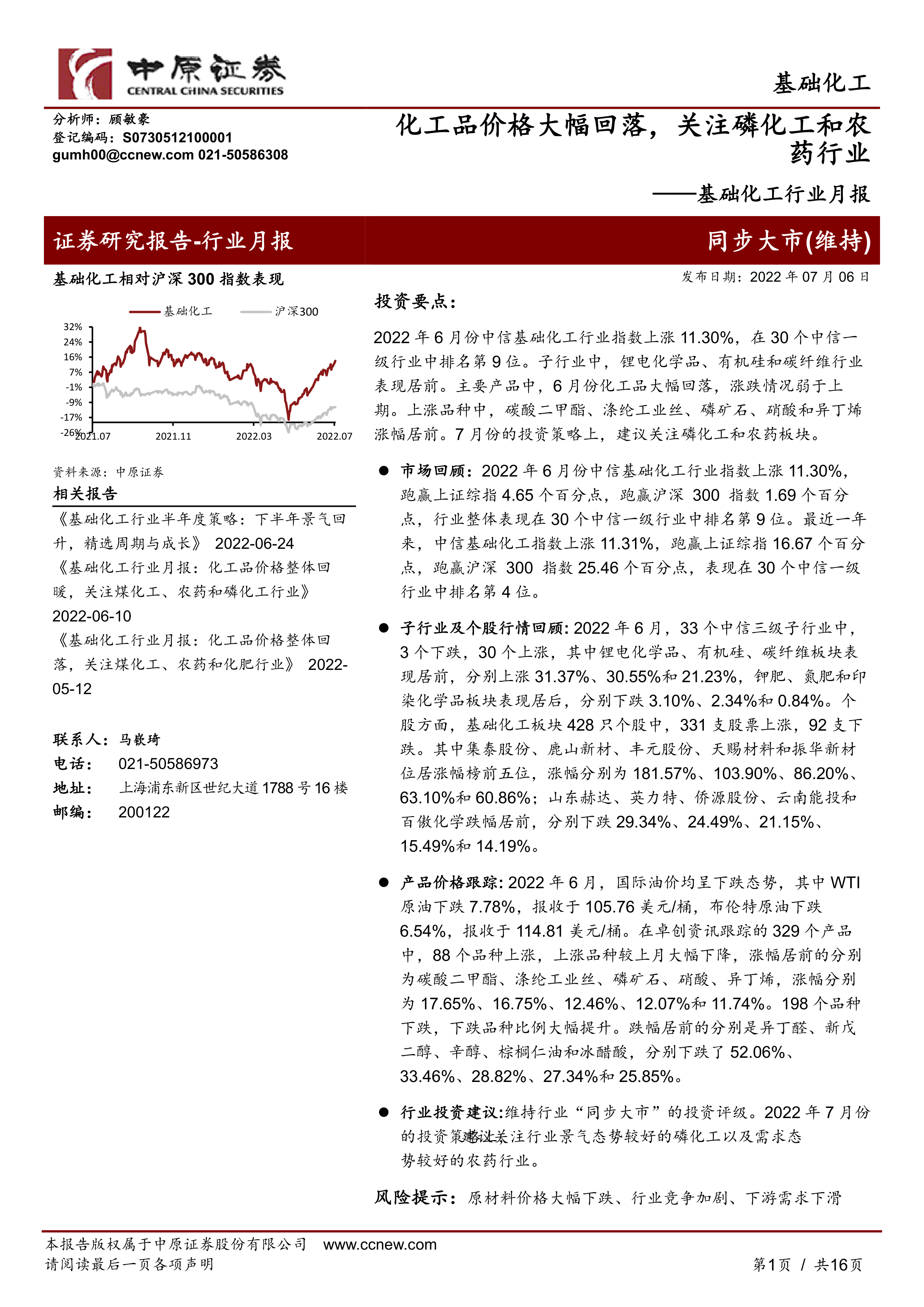本报告分析了2022年6月基础化工行业的市场表现,指出行业指数上涨,但化工品价格普遍回落。报告重点关注了行业要闻,包括利润增长、PBAT类树脂风险、电价调整、碳关税影响等。 报告建议关注磷化工和农药板块,并维持行业“同步大市”的投资评级。 报告还提示了原材料价格下跌、行业竞争加剧、下游需求下滑等风险。
