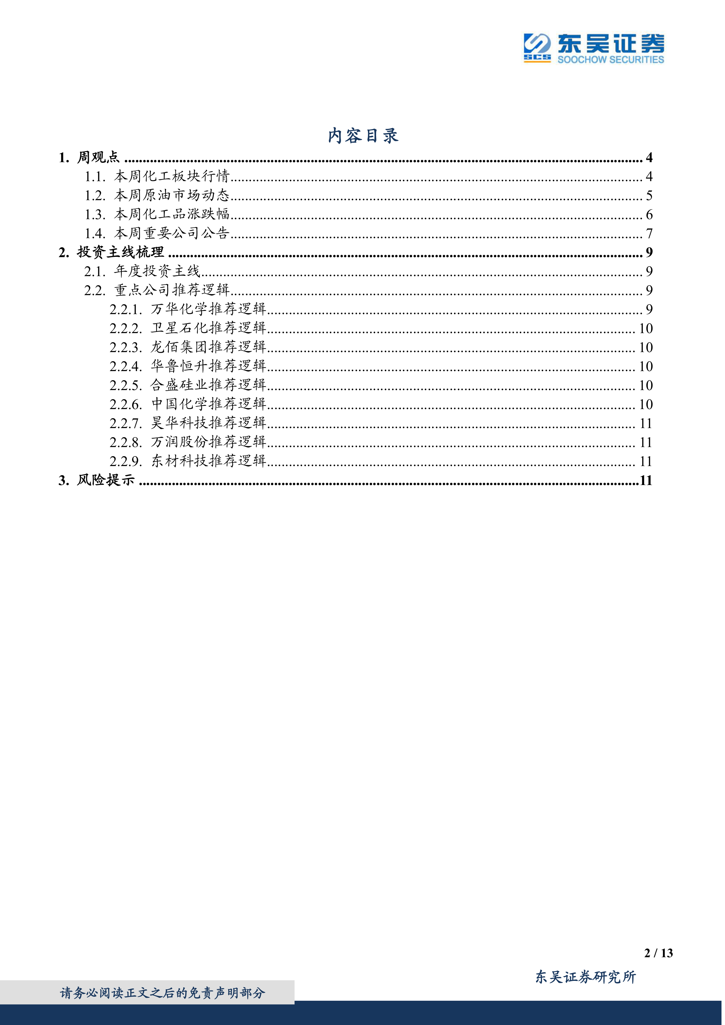 本报告分析了化工行业2021年8月第四周的市场表现、行业动态和投资主线。 报告指出,化工板块本周表现强势,原油价格上涨,化工品价格涨跌分化。 报告重点推荐了万华化学、卫星石化等公司,并提示了行业风险。 投资者应关注顺周期化工品盈利改善、自主可控趋势下的细分成长赛道,并注意规避风险。