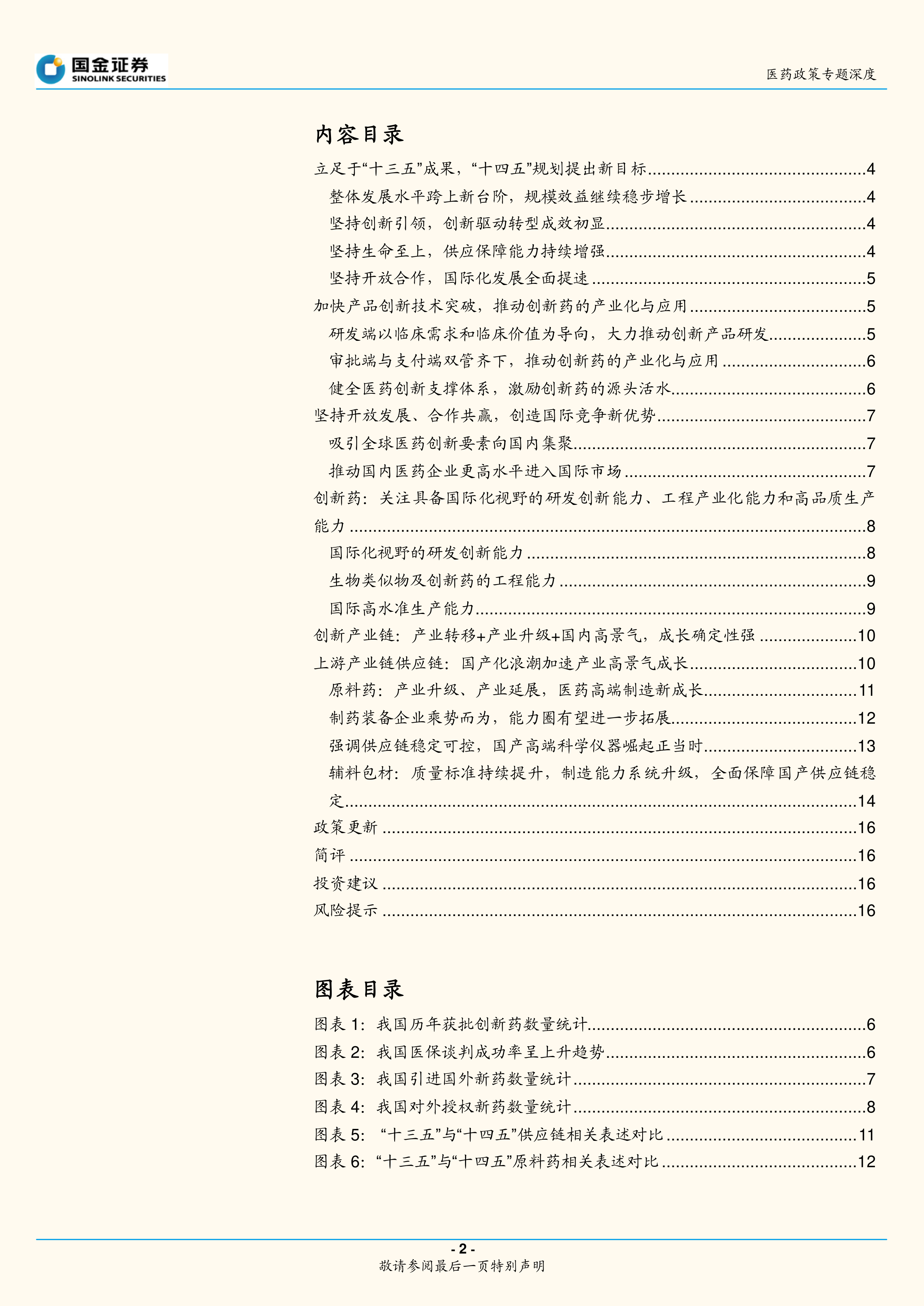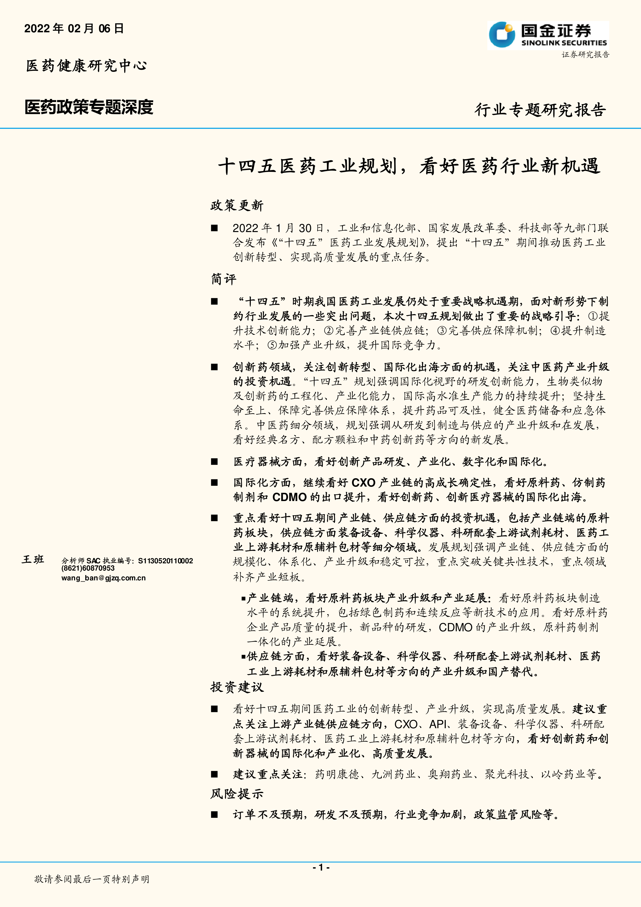 看好十四五期间医药工业的创新转型、产业升级,实现高质量发展。建议重点关注上游产业链供应链方向,CXO、API、装备设备、科学仪器、科研配套上游试剂耗材、医药工业上游耗材和原辅料包材等方向,看好创新药和创新器械的国际化和产业化、高质量发展。