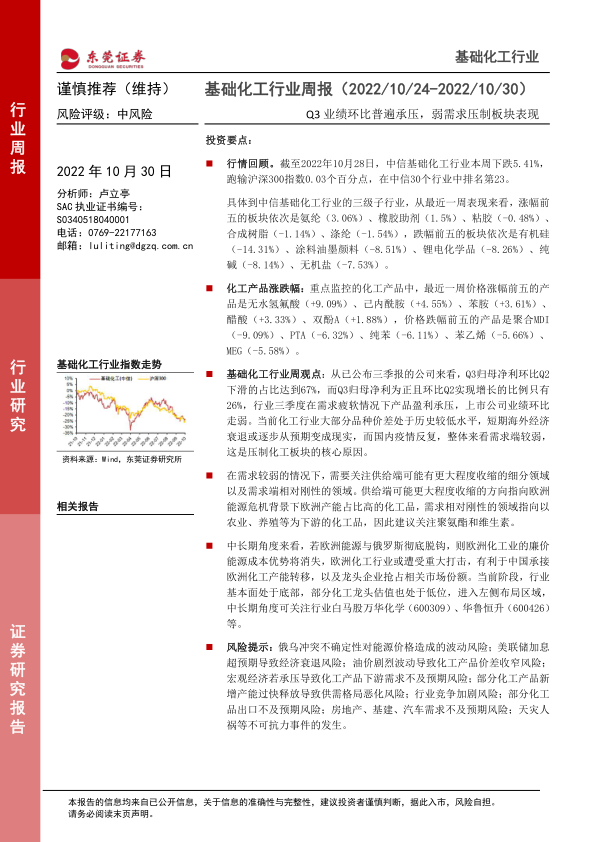 本报告的核心观点是,基础化工行业在2022年10月24日至10月30日期间表现疲软,主要受需求端疲软影响。三季度业绩普遍承压,盈利能力下降。