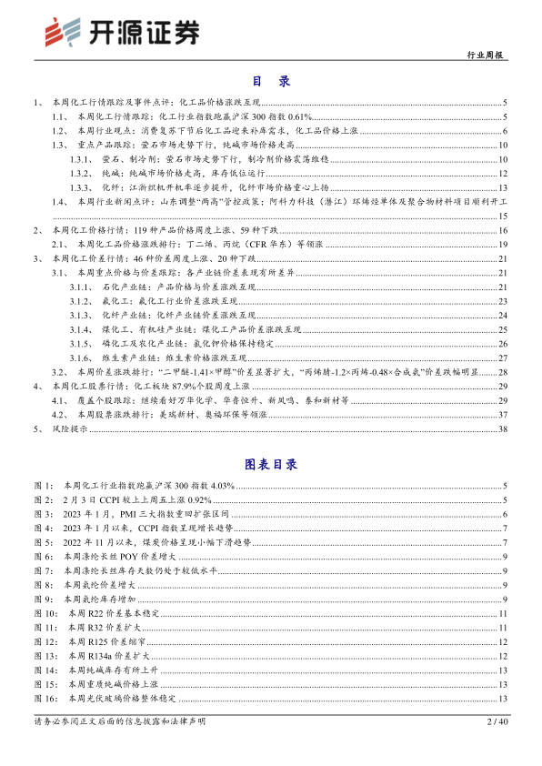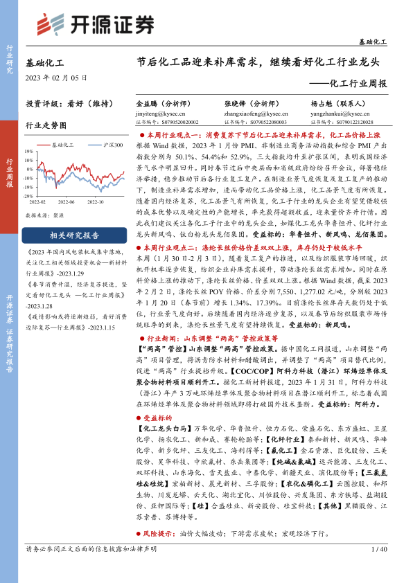 本周行业观点一:消费复苏下节后化工品迎来补库需求,化工品价格上涨根据Wind数据,2023年1月份PMI、非制造业商务活动指数和综合PMI产出指数分别为50.1%、54.4%和52.9%,三大指数均升至扩张区间,表明我国经济景气水平明显回升。同时春节过后中央层面和省级政府纷纷召开会议,部署稳经济举措,稳步推动节后各行业复工复产。在制造业景气度恢复及复工复产的推动下,制造业补库需求增加,进而带动化工品价格上涨,化工品景气度有所恢复。随着国内经济复苏,化工品景气有所恢复,化工子行业的龙头企业有望凭借较强的成本优势以及确定性的产能增长,率先获得超额收益,迎来量价齐升行情。因此我们建议关注各化工子行业中的龙头企业,如煤化工龙头华鲁恒升、化纤行业龙头新凤鸣、钛白粉龙头龙佰集团。受益标的:华鲁恒升、新凤鸣、龙佰集团。