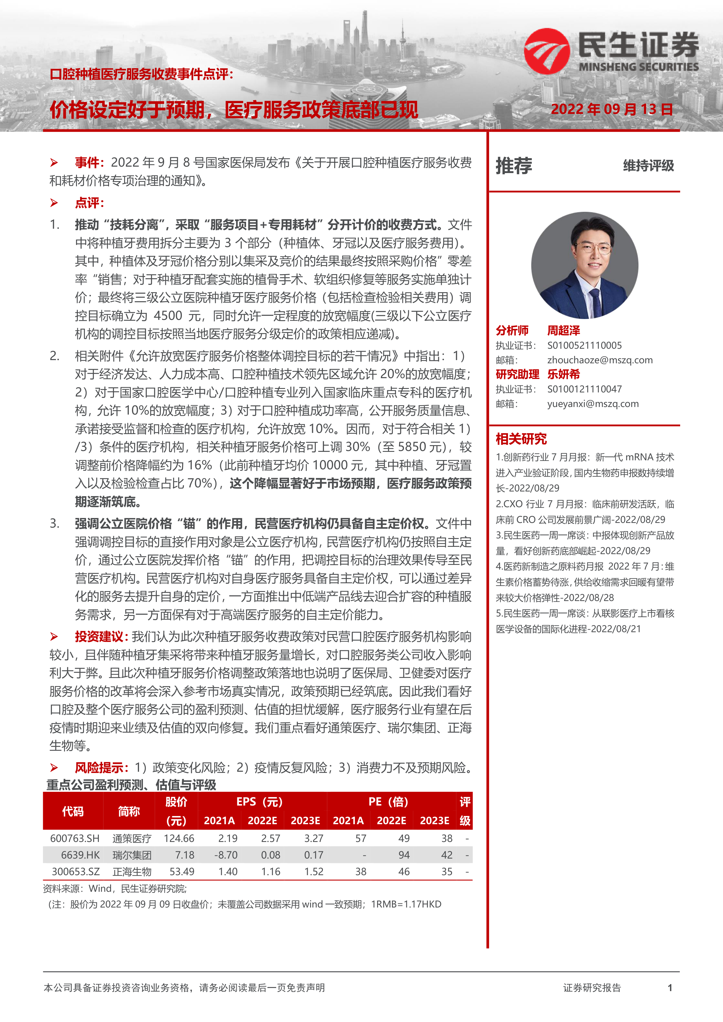 投资建议:我们认为此次种植牙服务收费政策对民营口腔医疗服务机构影响较小,且伴随种植牙集采将带来种植牙服务量增长,对口腔服务类公司收入影响利大于弊。且此次种植牙服务价格调整政策落地也说明了医保局、卫健委对医疗服务价格的改革将会深入参考市场真实情况,政策预期已经筑底。因此我们看好口腔及整个医疗服务公司的盈利预测、估值的担忧缓解,医疗服务行业有望在后疫情时期迎来业绩及估值的双向修复。我们重点看好通策医疗、瑞尔集团、正海生物等。
