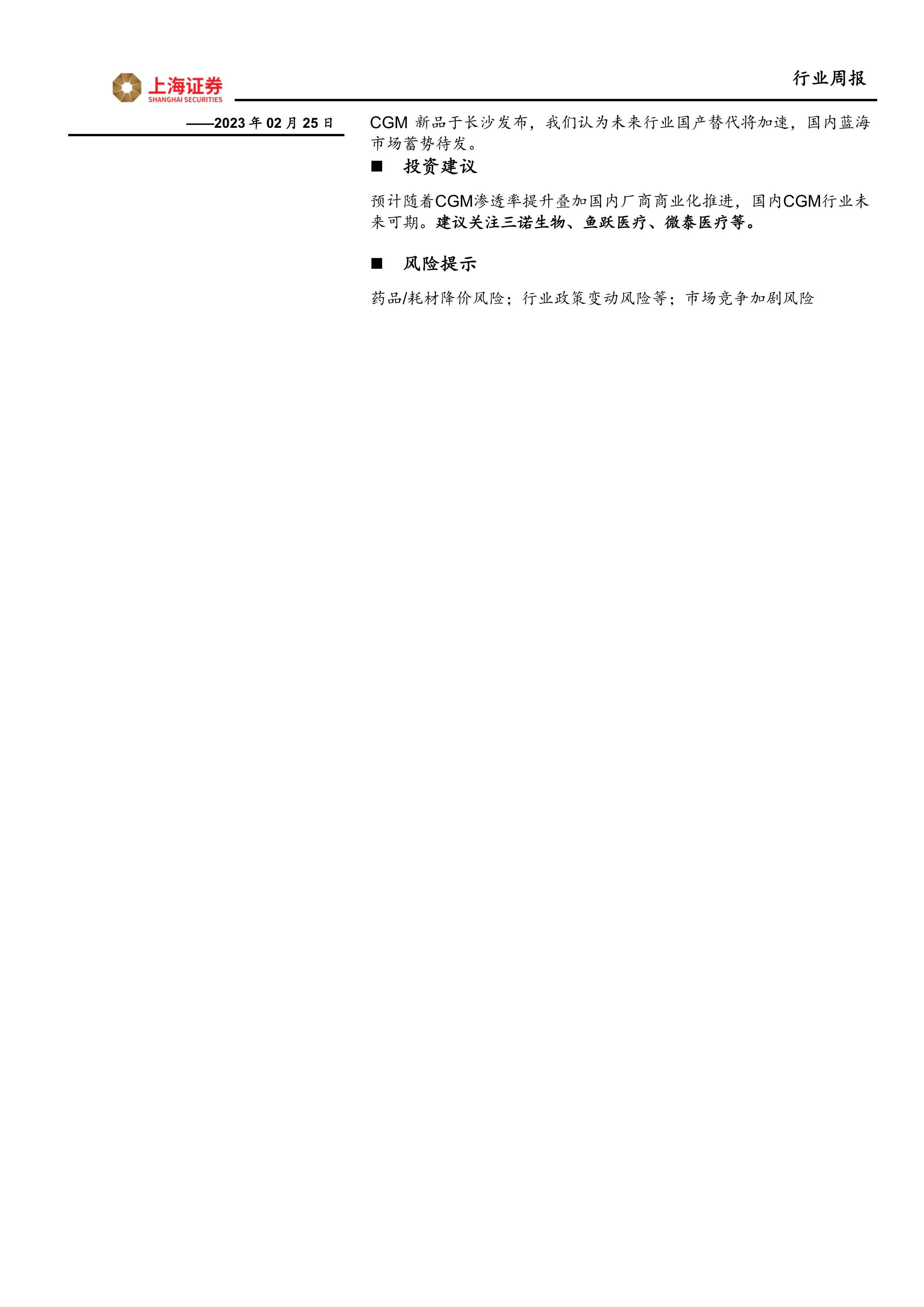 本报告重点关注了 CGM 市场,分析了其在中国市场的巨大潜力,并强调了国产替代的加速趋势。报告还回顾了上周医药生物行业的市场表现,提供了行业要闻、上市公司动态以及相关个股的投资建议。 报告认为,随着中国糖尿病患者数量的增加和对血糖监测需求的提升,CGM 市场将迎来快速增长,投资者可关注相关领域的投资机会。同时,报告也提示了药品/耗材降价、行业政策变动和市场竞争加剧等风险。