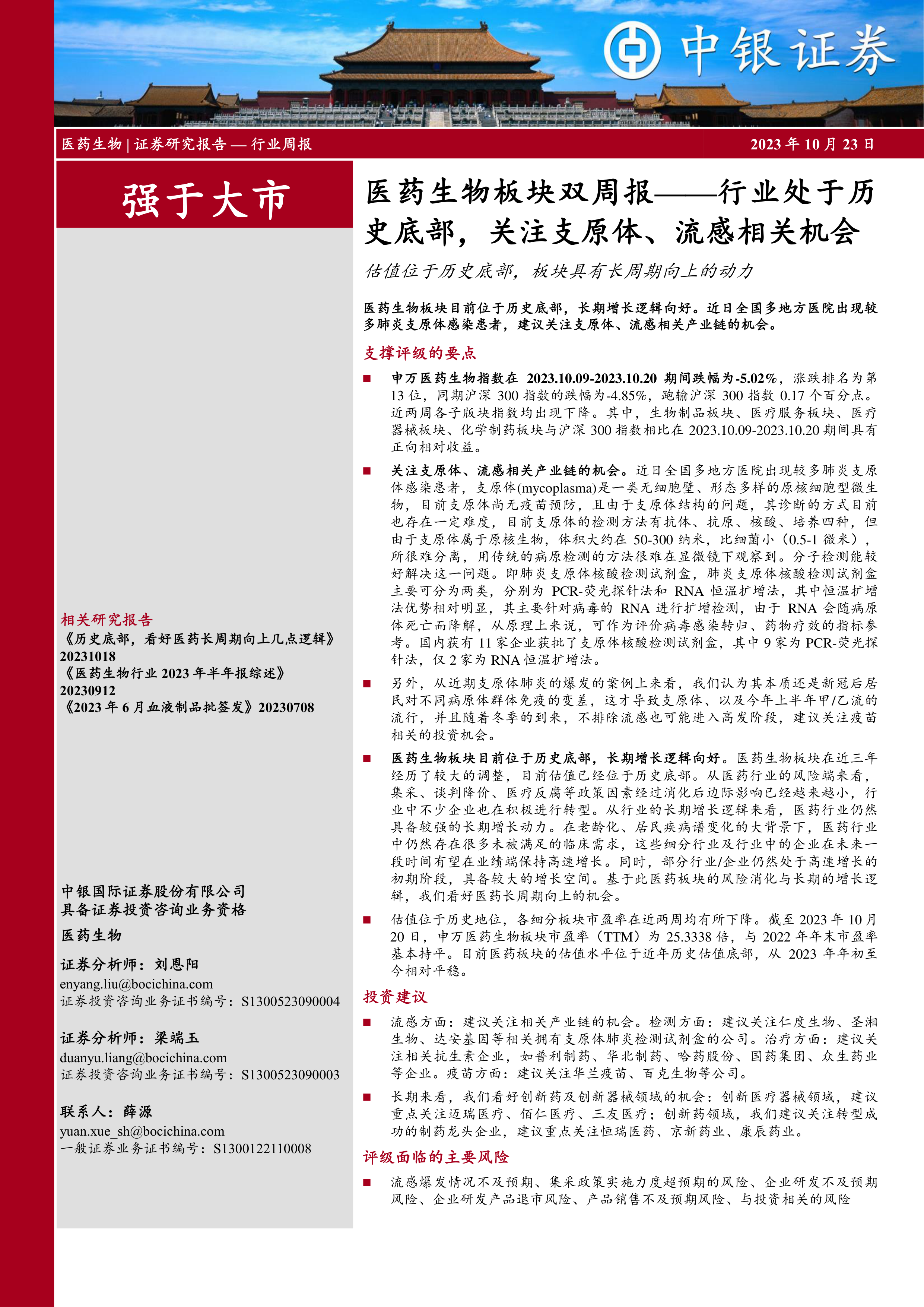 本报告分析了医药生物板块的近期市场表现和估值情况,指出行业目前处于历史底部。报告重点关注了近期肺炎支原体感染和流感爆发带来的投资机会,并建议关注相关产业链上的公司。同时,报告强调了医药行业长期增长的逻辑,并建议关注创新药和创新器械领域,以及转型成功的制药龙头企业。