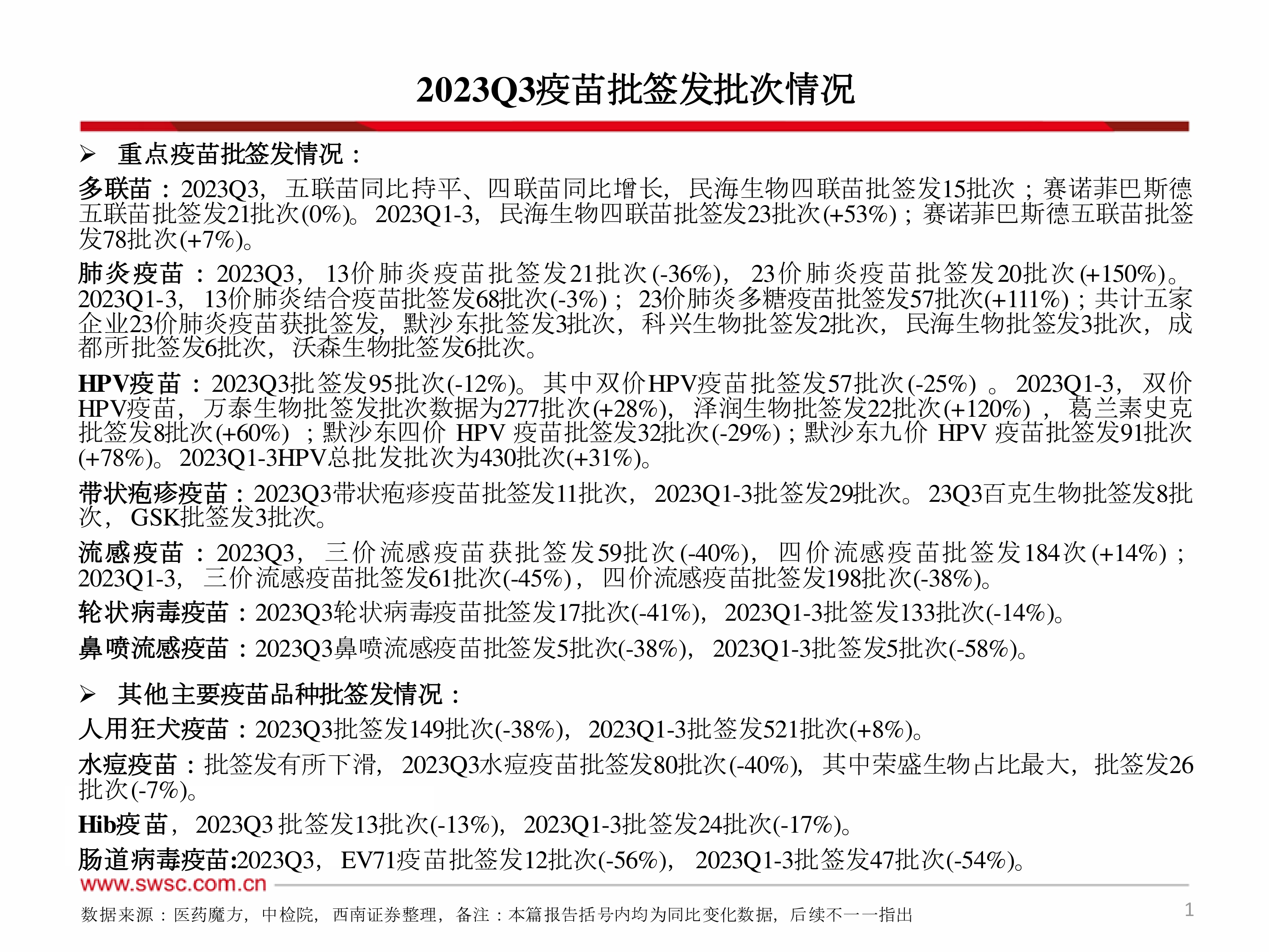 本报告主要分析了2023年第三季度中国疫苗行业的批签发情况,并对各主要疫苗品种的市场表现进行了深入解读。报告指出,2023年Q3疫苗批签发整体呈现分化态势,部分疫苗品种批签发量有所下滑,但也有部分品种表现出回暖迹象。其中,多联苗、肺炎疫苗、HPV疫苗、流感疫苗等重点品种的批签发情况备受关注。报告还对各主要疫苗品种的市场竞争格局、企业表现以及未来发展趋势进行了分析,并提供了投资建议和风险提示。