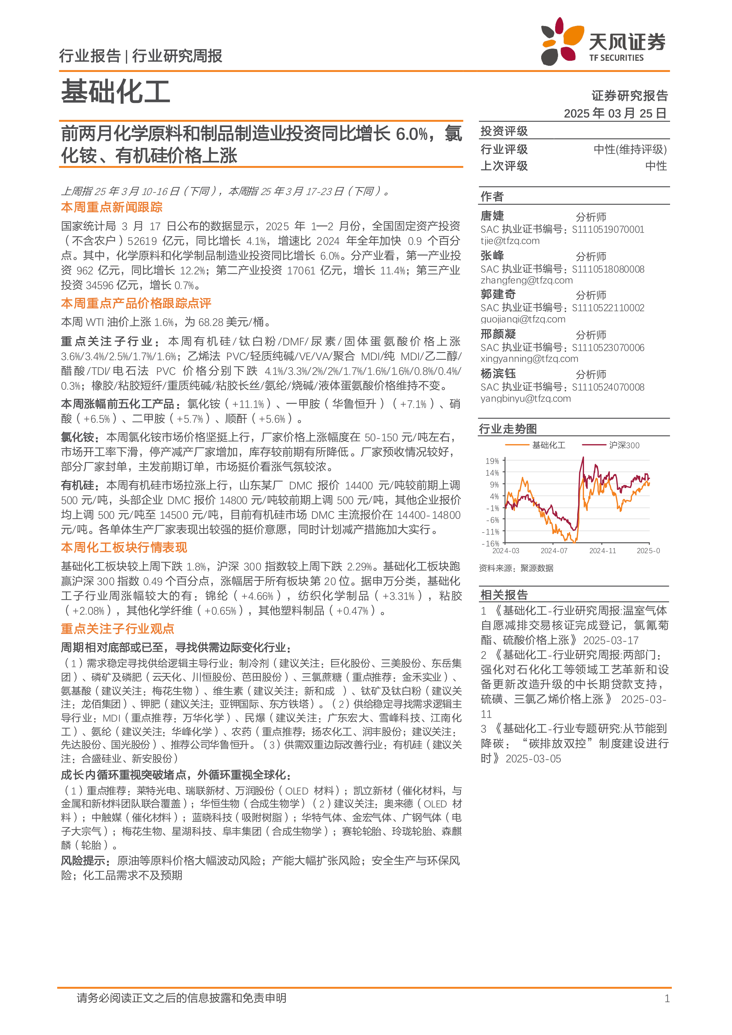 基础化工行业研究周报:前两月化学原料和制品制造业投资同比增长6.0%,氯化铵、有机硅价格上涨