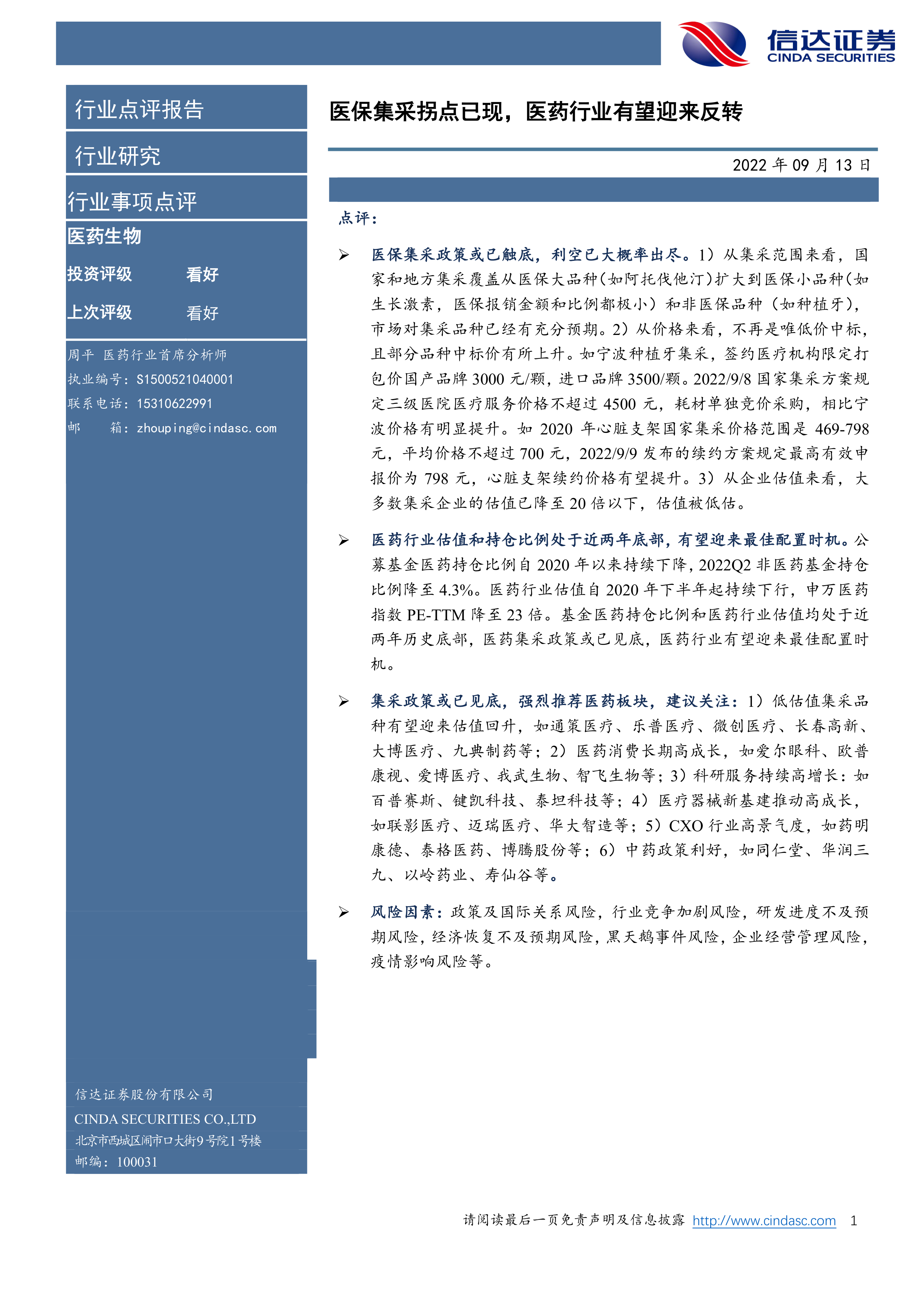 医保集采政策或已触底,利空已大概率出尽。1)从集采范围来看,国家和地方集采覆盖从医保大品种(如阿托伐他汀)扩大到医保小品种(如生长激素,医保报销金额和比例都极小)和非医保品种(如种植牙),市场对集采品种已经有充分预期。2)从价格来看,不再是唯低价中标,且部分品种中标价有所上升。如宁波种植牙集采,签约医疗机构限定打包价国产品牌3000元/颗,进口品牌3500/颗。2022/9/8国家集采方案规定三级医院医疗服务价格不超过4500元,耗材单独竞价采购,相比宁波价格有明显提升。如2020年心脏支架国家集采价格范围是469-798元,平均价格不超过700元,2022/9/9发布的续约方案规定最高有效申报价为798元,心脏支架续约价格有望提升。3)从企业估值来看,大多数集采企业的估值已降至20倍以下,估值被低估。