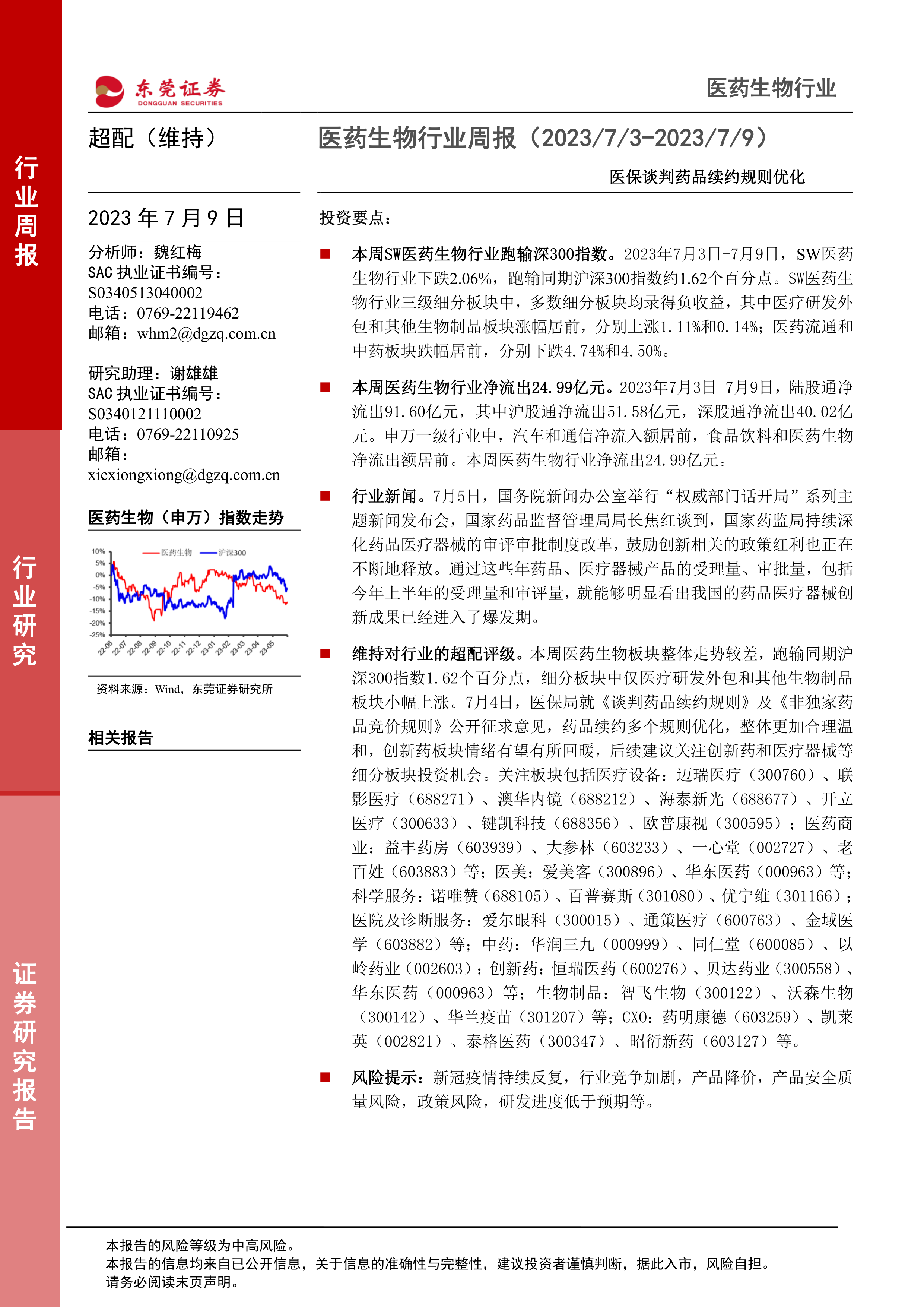 本报告分析了2023年7月3日至7月9日医药生物行业的市场表现,指出行业跑输大盘,但估值处于相对低位。报告还分析了行业政策、新闻动态和上市公司公告,并维持对行业的超配评级,建议关注创新药和医疗器械等细分板块。同时,报告也提示了行业面临的风险。