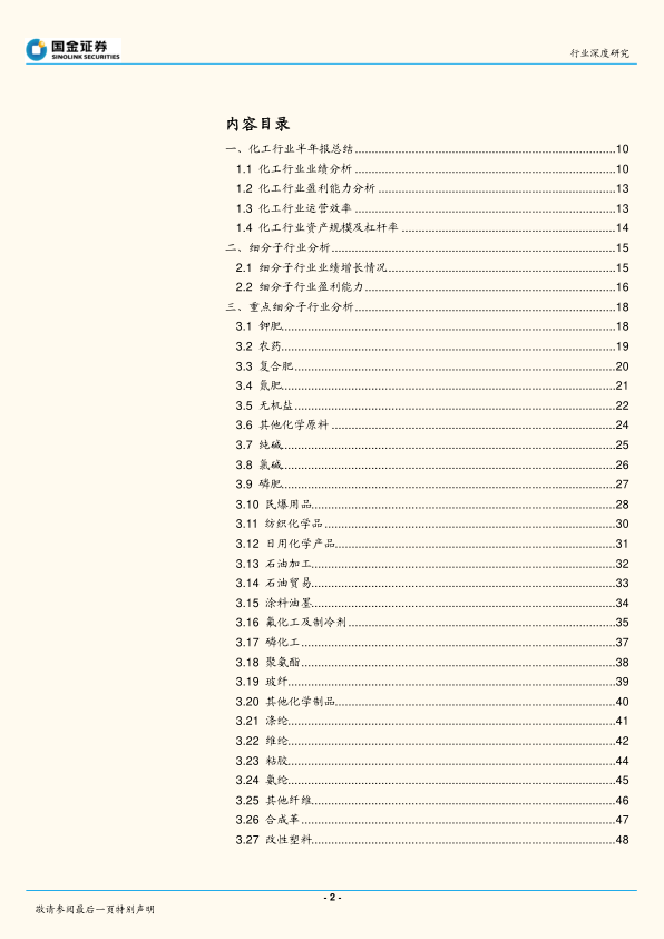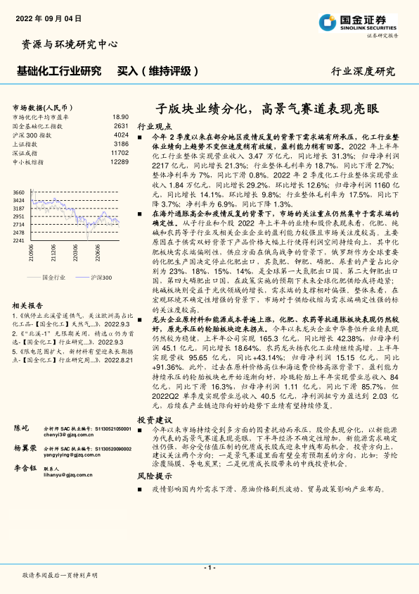 本报告分析了2022年上半年化工行业的整体表现,指出行业营收和利润实现增长,但增速放缓,盈利能力有所回落。子行业表现分化,钾肥、磷化工等行业表现突出,而部分行业面临挑战。报告建议关注高景气赛道中的壁垒型企业和优质成长股,把握中线投资机会。同时,报告也提示了疫情、原油价格波动和贸易政策等风险因素。