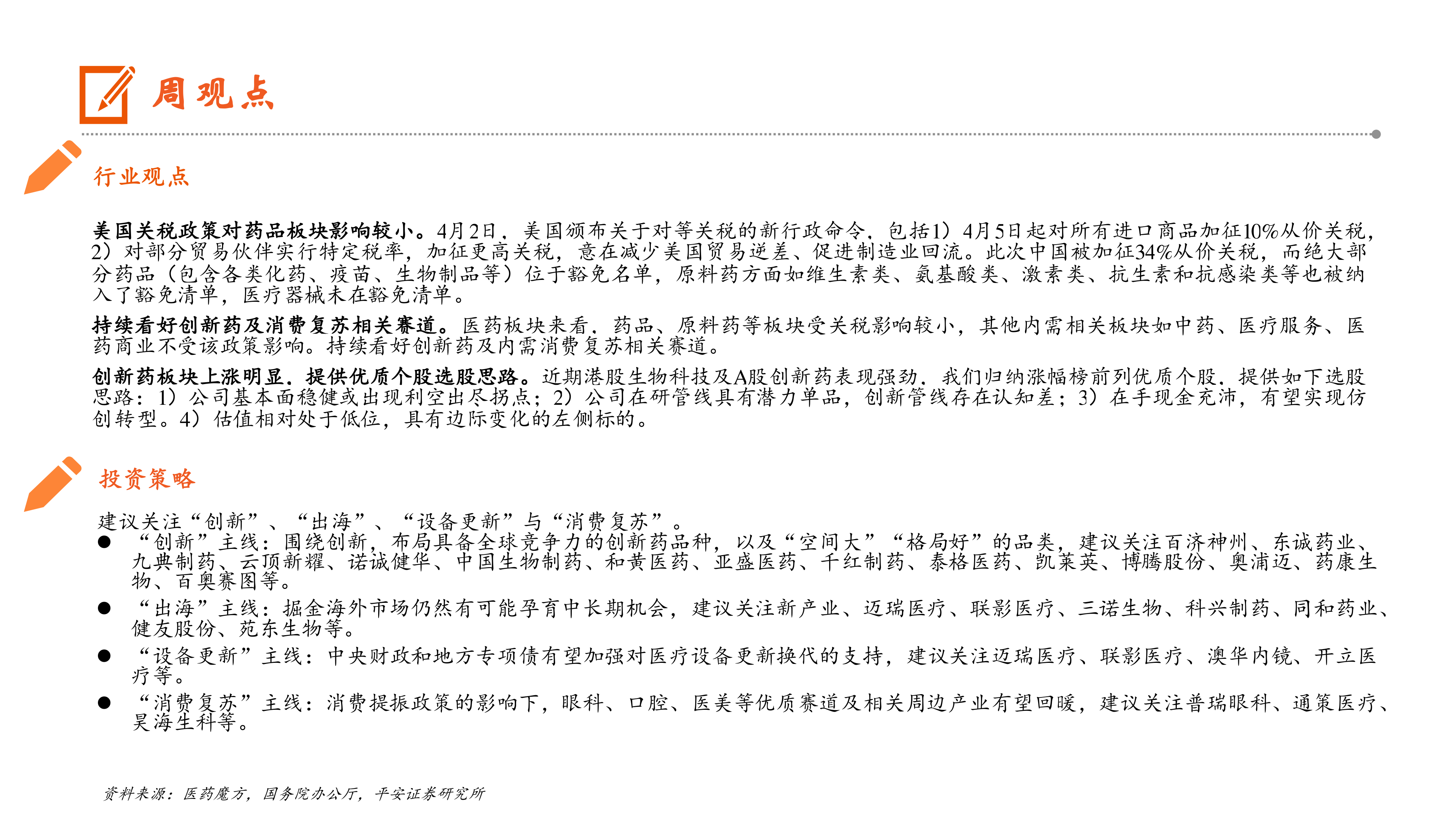 持续看好创新药及消费复苏相关赛道。医药板块来看,药品、原料药等板块受关税影响较小,其他内需相关板块如中药、医疗服务、医药商业不受该政策影响。持续看好创新药及内需消费复苏相关赛道。