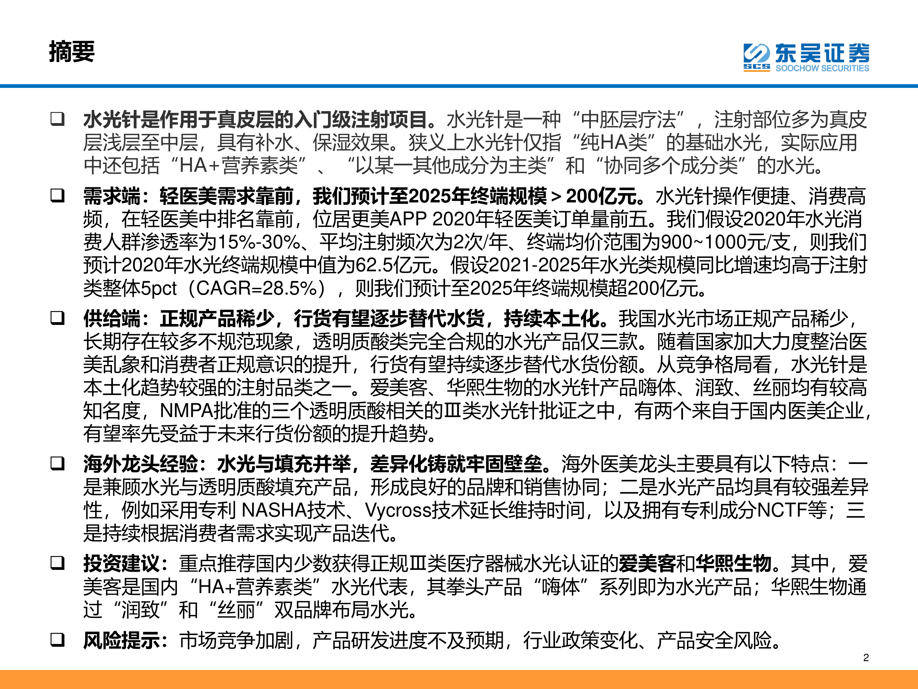 本报告的核心观点是:水光针作为轻医美入门级项目,市场需求旺盛,预计至2025年终端规模将超过200亿元。同时,水光针市场呈现明显的本土化趋势,国内企业有望受益于行业发展。报告还分析了海外龙头企业的经验,并重点推荐了国内少数获得正规Ⅲ类医疗器械水光认证的爱美客和华熙生物。