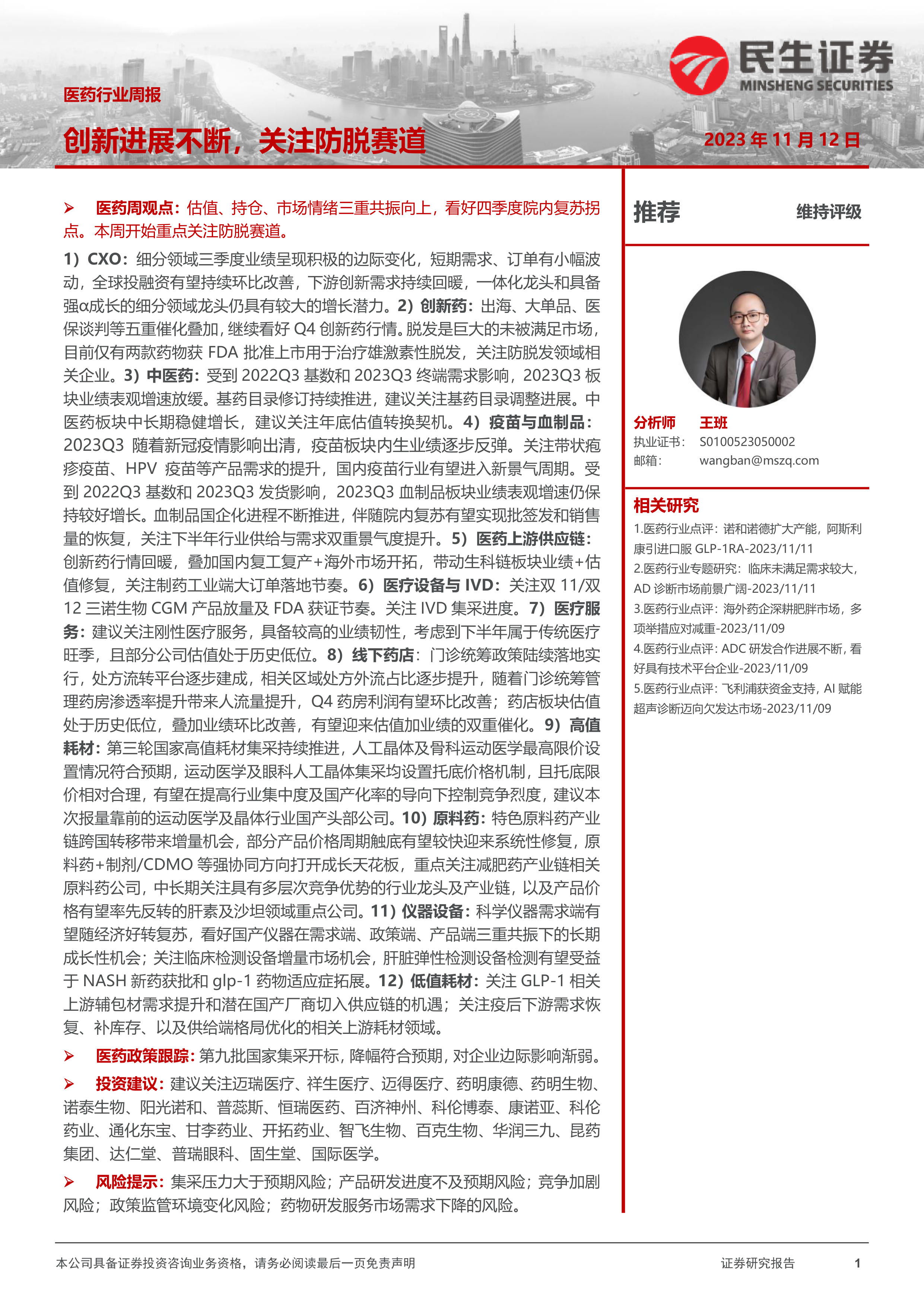 1)CXO:细分领域三季度业绩呈现积极的边际变化,短期需求、订单有小幅波动,全球投融资有望持续环比改善,下游创新需求持续回暖,一体化龙头和具备强α成长的细分领域龙头仍具有较大的增长潜力。2)创新药:出海、大单品、医保谈判等五重催化叠加,继续看好Q4创新药行情。脱发是巨大的未被满足市场,目前仅有两款药物获FDA批准上市用于治疗雄激素性脱发,关注防脱发领域相关企业。3)中医药:受到2022Q3基数和2023Q3终端需求影响,2023Q3板块业绩表观增速放缓。基药目录修订持续推进,建议关注基药目录调整进展。中医药板块中长期稳健增长,建议关注年底估值转换契机。4)疫苗与血制品:2023Q3随着新冠疫情影响出清,疫苗板块内生业绩逐步反弹。关注带状疱疹疫苗、HPV疫苗等产品需求的提升,国内疫苗行业有望进入新景气周期。受到2022Q3基数和2023Q3发货影响,2023Q3血制品板块业绩表观增速仍保持较好增长。血制品国企化进程不断推进,伴随院内复苏有望实现批签发和销售量的恢复,关注下半年行业供给与需求双重景气度提升。5)医药上游供应链:创新药行情回暖,叠加国内复工复产+海外市场开拓,带动生科链板块业绩+估值修复,关注制药工业端大订单落地节奏。6)医疗设备与IVD:关注双11/双12三诺生物CGM产品放量及FDA获证节奏。关注IVD集采进度。7)医疗服务:建议关注刚性医疗服务,具备较高的业绩韧性,考虑到下半年属于传统医疗旺季,且部分公司估值处于历史低位。8)线下药店:门诊统筹政策陆续落地实行,处方流转平台逐步建成,相关区域处方外流占比逐步提升,随着门诊统筹管理药房渗透率提升带来人流量提升,Q4药房利润有望环比改善;药店板块估值处于历史低位,叠加业绩环比改善,有望迎来估值加业绩的双重催化。9)高值耗材:第三轮国家高值耗材集采持续推进,人工晶体及骨科运动医学最高限价设置情况符合预期,运动医学及眼科人工晶体集采均设置托底价格机制,且托底限价相对合理,有望在提高行业集中度及国产化率的导向下控制竞争烈度,建议本次报量靠前的运动医学及晶体行业国产头部公司。10)原料药:特色原料药产业链跨国转移带来增量机会,部分产品价格周期触底有望较快迎来系统性修复,原料药+制剂/CDMO等强协同方向打开成长天花板,重点关注减肥药产业链相关原料药公司,中长期关注具有多层次竞争优势的行业龙头及产业链,以及产品价格有望率先反转的肝素及沙坦领域重点公司。11)仪器设备:科学仪器需求端有望随经济好转复苏,看好国产仪器在需求端、政策端、产品端三重共振下的长期成长性机会;关注临床检测设备增量市场机会,肝脏弹性检测设备检测有望受益于NASH新药获批和glp-1药物适应症拓展。12)低值耗材:关注GLP-1相关上游辅包材需求提升和潜在国产厂商切入供应链的机遇;关注疫后下游需求恢复、补库存、以及供给端格局优化的相关上游耗材领域。