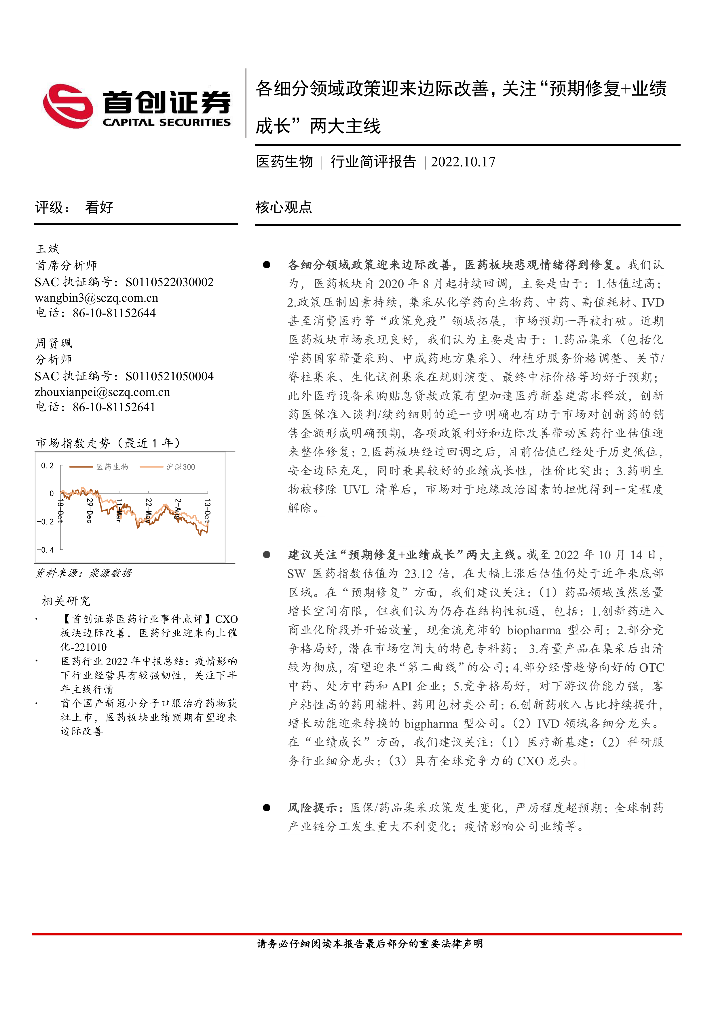 建议关注“预期修复+业绩成长”两大主线。截至2022年10月14日,SW医药指数估值为23.12倍,在大幅上涨后估值仍处于近年来底部区域。在“预期修复”方面,我们建议关注:(1)药品领域虽然总量增长空间有限,但我们认为仍存在结构性机遇,包括:1.创新药进入商业化阶段并开始放量,现金流充沛的biopharma型公司;2.部分竞争格局好,潜在市场空间大的特色专科药;3.存量产品在集采后出清较为彻底,有望迎来“第二曲线”的公司;4.部分经营趋势向好的OTC中药、处方中药和API企业;5.竞争格局好,对下游议价能力强,客户粘性高的药用辅料、药用包材类公司;6.创新药收入占比持续提升,增长动能迎来转换的bigpharma型公司。(2)IVD领域各细分龙头。在“业绩成长”方面,我们建议关注:(1)医疗新基建:(2)科研服务行业细分龙头;(3)具有全球竞争力的CXO龙头。
