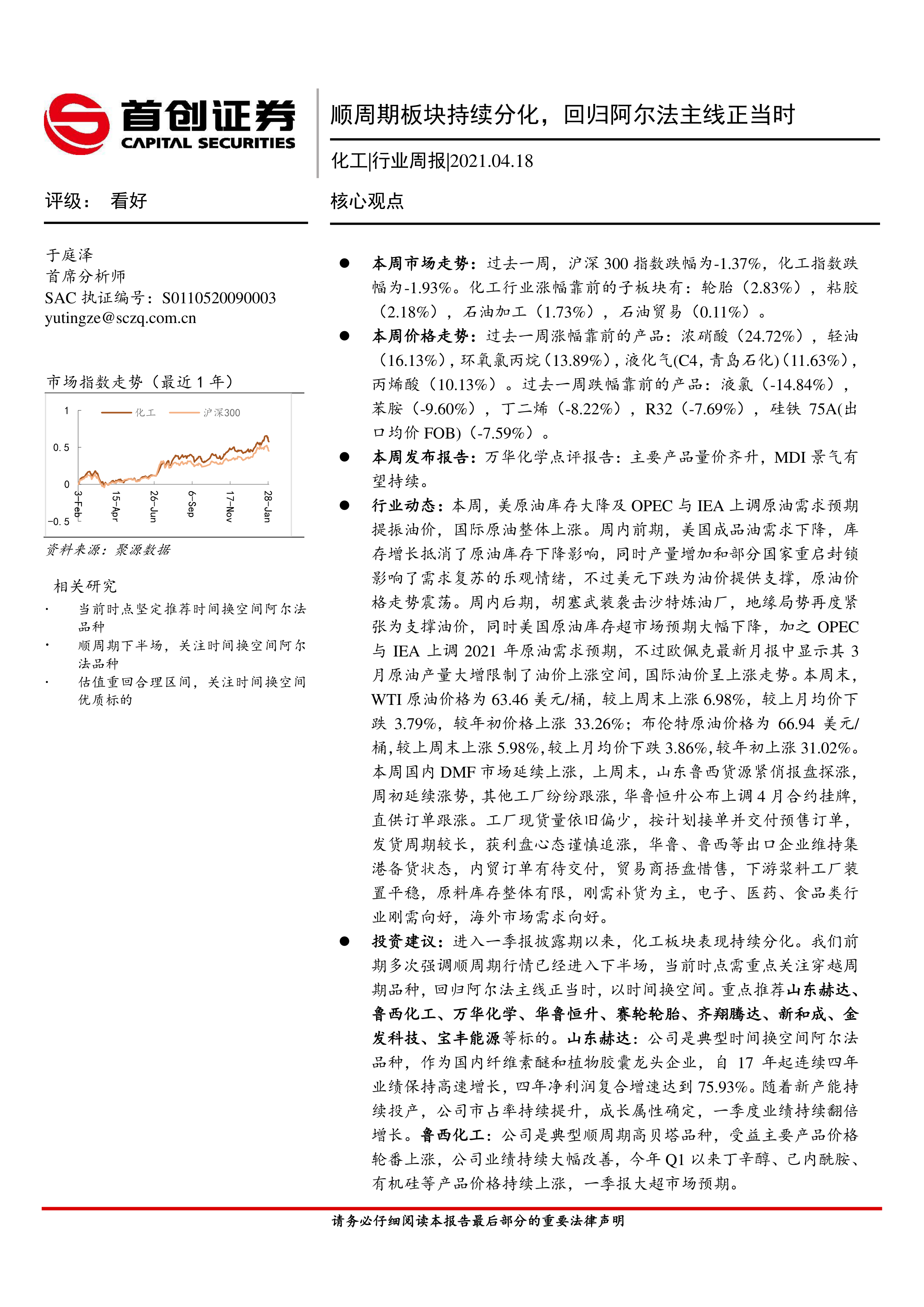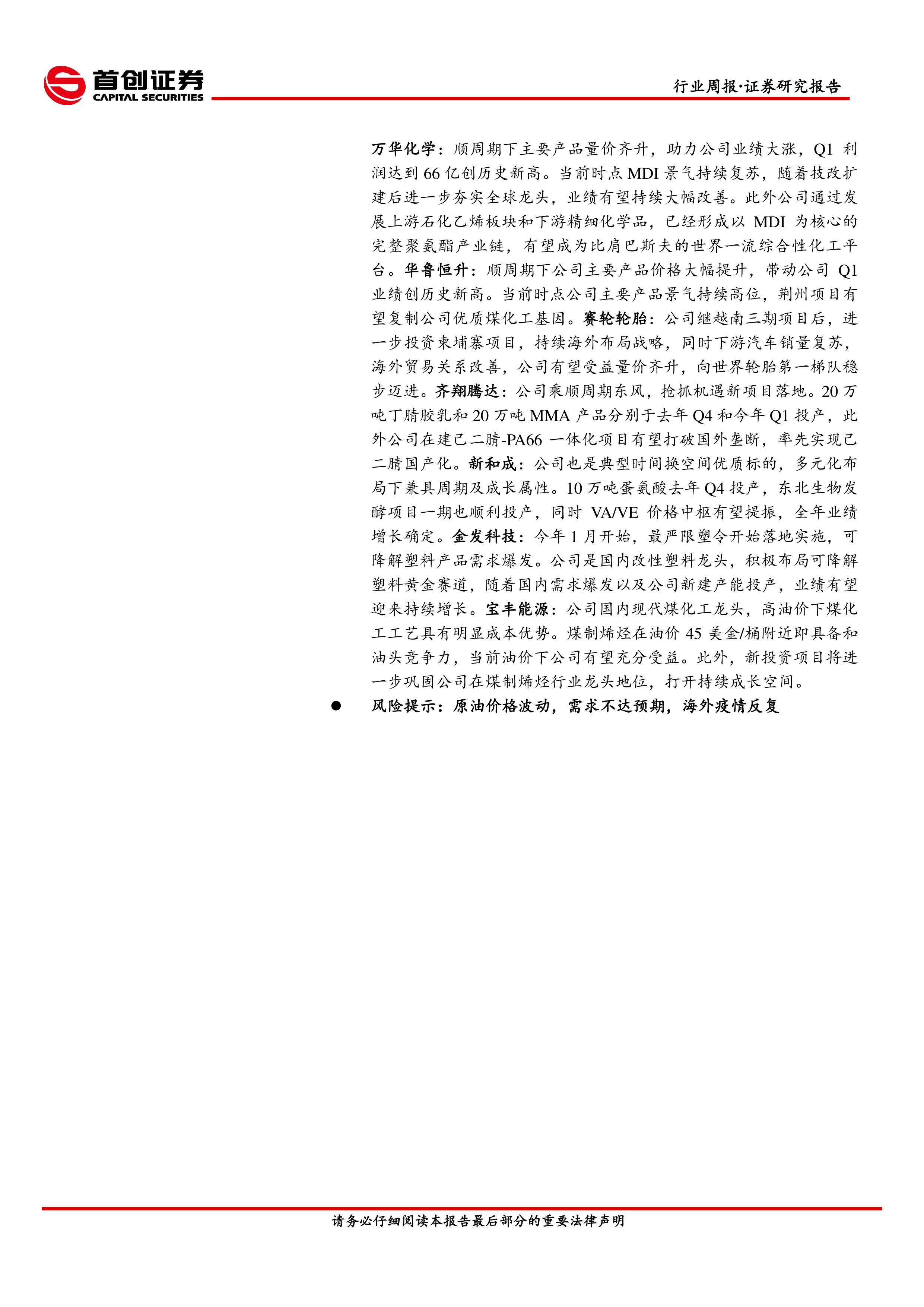 万华化学:顺周期下主要产品量价齐升,助力公司业绩大涨,Q1利润达到66亿创历史新高。当前时点MDI景气持续复苏,随着技改扩建后进一步夯实全球龙头,业绩有望持续大幅改善。此外公司通过发展上游石化乙烯板块和下游精细化学品,已经形成以MDI为核心的完整聚氨酯产业链,有望成为比肩巴斯夫的世界一流综合性化工平台。华鲁恒升:顺周期下公司主要产品价格大幅提升,带动公司Q1业绩创历史新高。当前时点公司主要产品景气持续高位,荆州项目有望复制公司优质煤化工基因。赛轮轮胎:公司继越南三期项目后,进一步投资柬埔寨项目,持续海外布局战略,同时下游汽车销量复苏,海外贸易关系改善,公司有望受益量价齐升,向世界轮胎第一梯队稳步迈进。齐翔腾达:公司乘顺周期东风,抢抓机遇新项目落地。20万吨丁腈胶乳和20万吨MMA产品分别于去年Q4和今年Q1投产,此外公司在建己二腈-PA66一体化项目有望打破国外垄断,率先实现己二腈国产化。新和成:公司也是典型时间换空间优质标的,多元化布局下兼具周期及成长属性。10万吨蛋氨酸去年Q4投产,东北生物发酵项目一期也顺利投产,同时VA/VE价格中枢有望提振,全年业绩增长确定。金发科技:今年1月开始,最严限塑令开始落地实施,可降解塑料产品需求爆发。公司是国内改性塑料龙头,积极布局可降解塑料黄金赛道,随着国内需求爆发以及公司新建产能投产,业绩有望迎来持续增长。宝丰能源:公司国内现代煤化工龙头,高油价下煤化工工艺具有明显成本优势。煤制烯烃在油价45美金/桶附近即具备和油头竞争力,当前油价下公司有望充分受益。此外,新投资项目将进一步巩固公司在煤制烯烃行业龙头地位,打开持续成长空间。