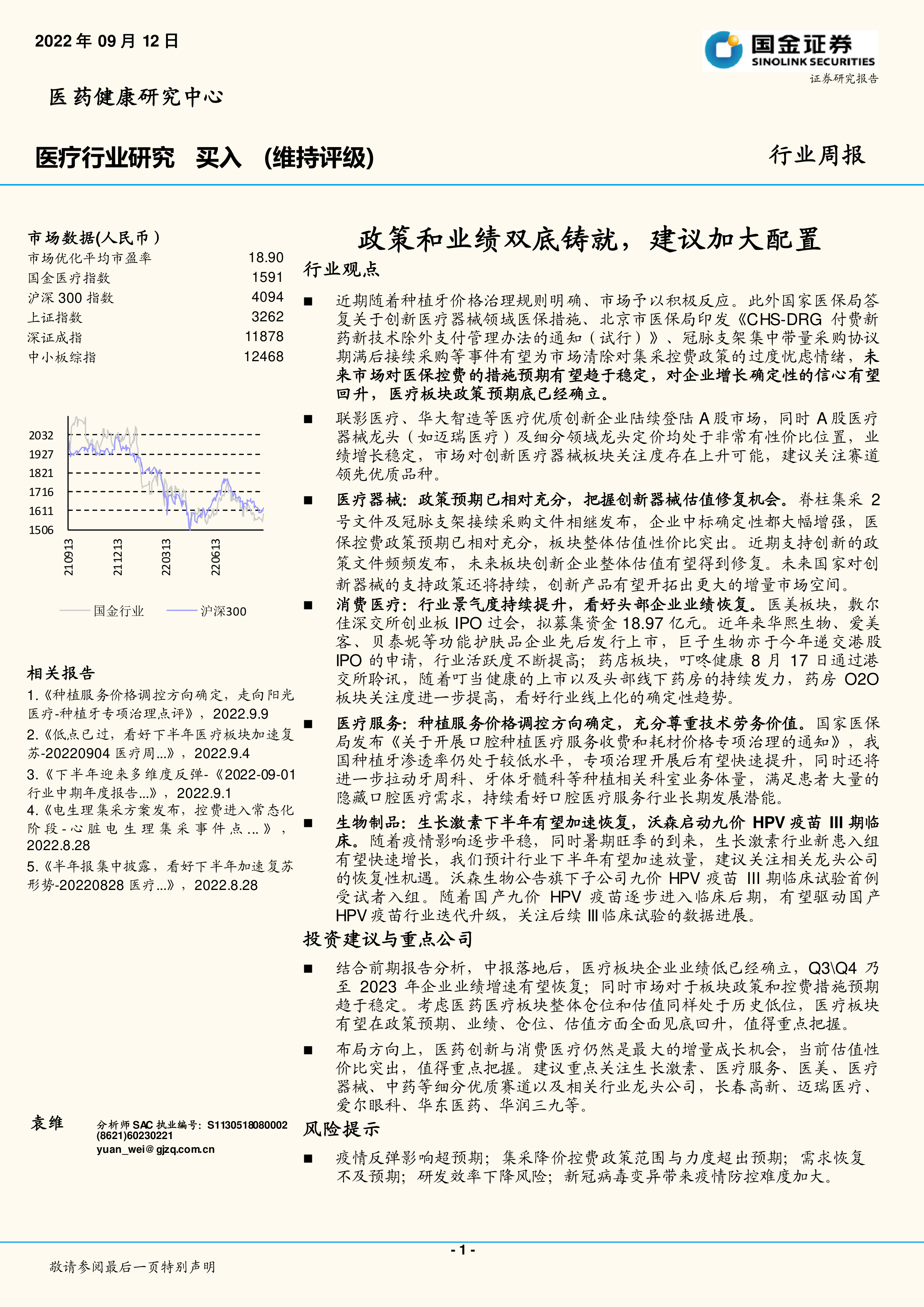 结合前期报告分析,中报落地后,医疗板块企业业绩低已经确立,Q3\Q4乃至2023年企业业绩增速有望恢复;同时市场对于板块政策和控费措施预期趋于稳定。考虑医药医疗板块整体仓位和估值同样处于历史低位,医疗板块有望在政策预期、业绩、仓位、估值方面全面见底回升,值得重点把握。