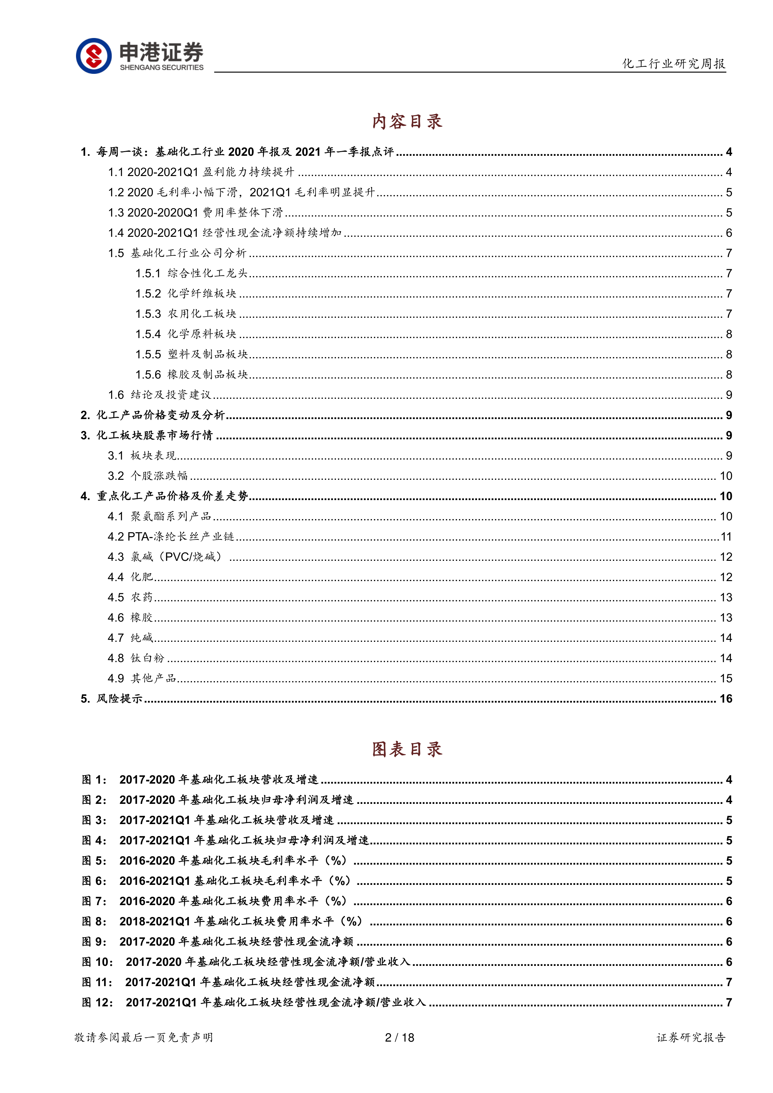 本报告分析了基础化工行业2020年报及2021年一季报,指出行业整体呈现景气周期延续、业绩向好的趋势。 盈利能力持续提升,毛利率和费用率表现分化。 报告还分析了重点公司的业绩表现,并给出了投资建议,建议关注行业龙头企业。 此外,报告还分析了化工产品价格变动情况,为投资者提供了参考。