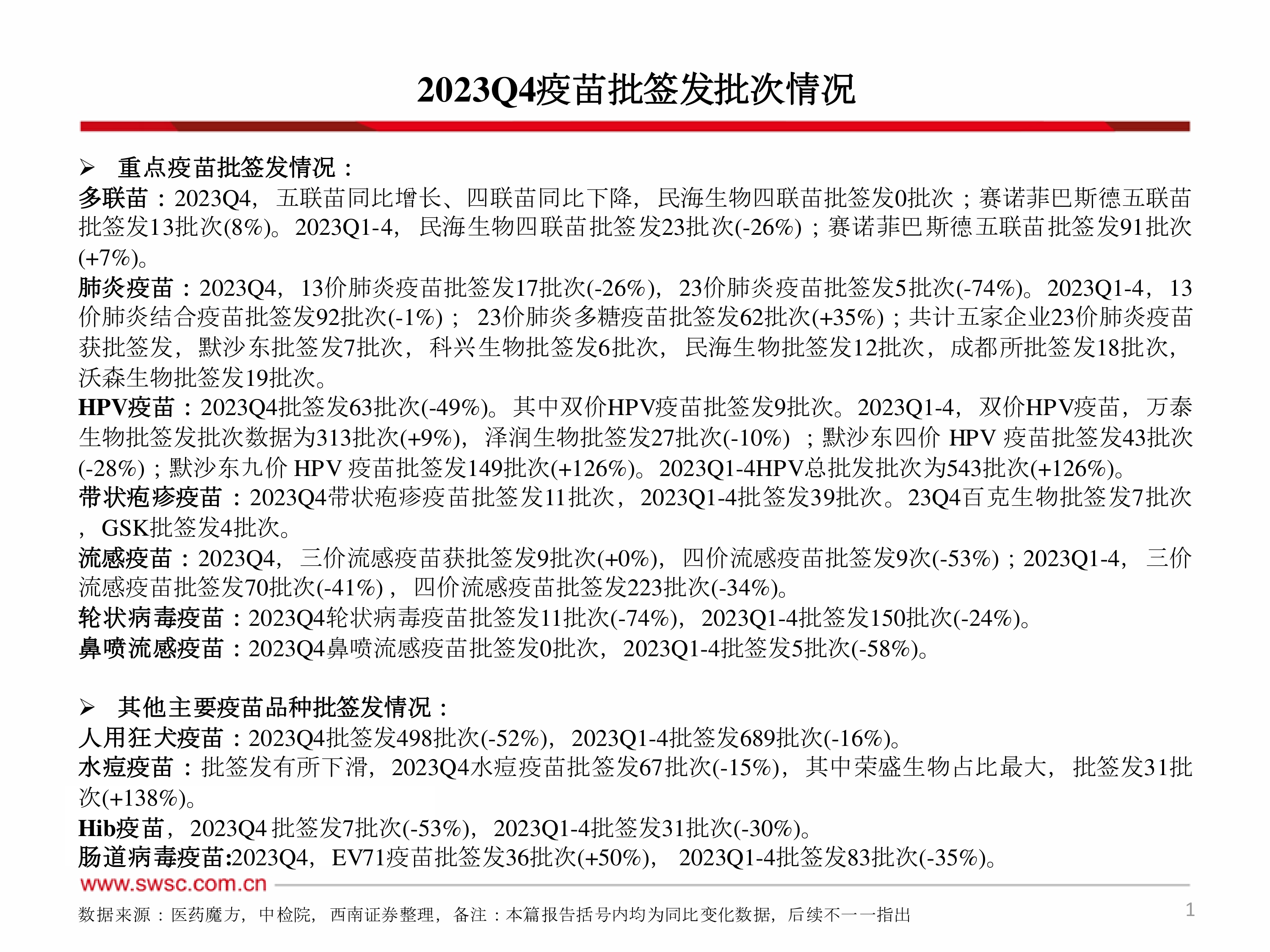 本报告分析了2023年Q4及全年的疫苗批签发情况,指出疫苗市场呈现分化态势,不同品种表现各异。报告重点分析了多联苗、肺炎疫苗、HPV疫苗、流感疫苗、狂犬疫苗等主要品种的批签发数据,并对市场竞争格局进行了分析。同时,报告也提示了疫苗行业的政策及风险。