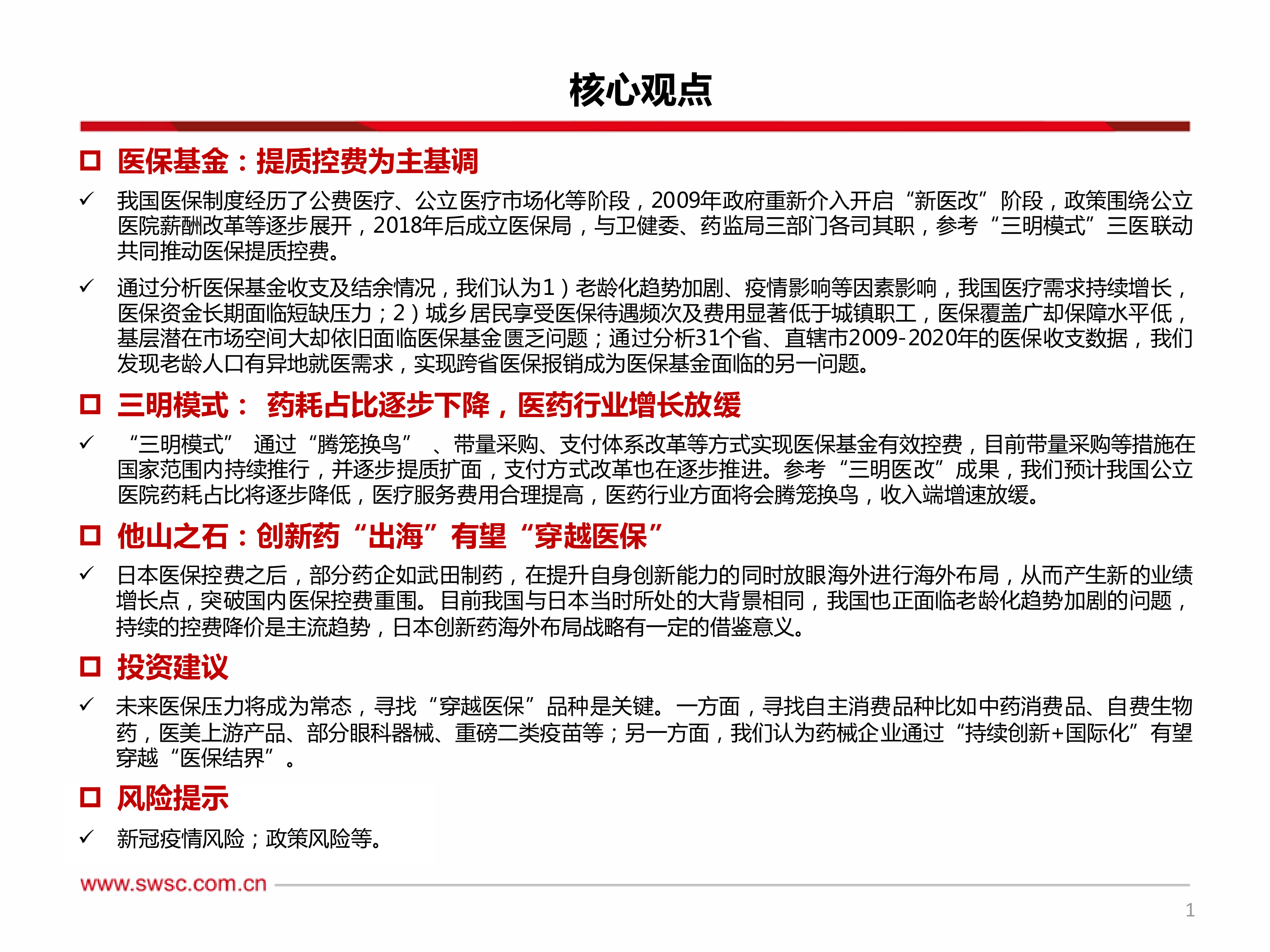 本报告深入分析了我国医保基金面临的挑战,强调了 “创新+国际化” 是药械企业应对医保控费、实现可持续发展的关键。报告指出,在老龄化加剧、医疗需求增长的背景下,医保基金面临多重压力,而 “三明模式” 等改革经验为解决这些问题提供了有益借鉴。同时,报告分析了带量采购、医保目录调整、DRG/DIP 付费方式等政策对药械行业的影响,并以日本药企为例,探讨了创新药企出海的策略。 报告认为,药械企业应积极进行创新,拓展国际市场,以应对医保控费带来的挑战,实现可持续发展。