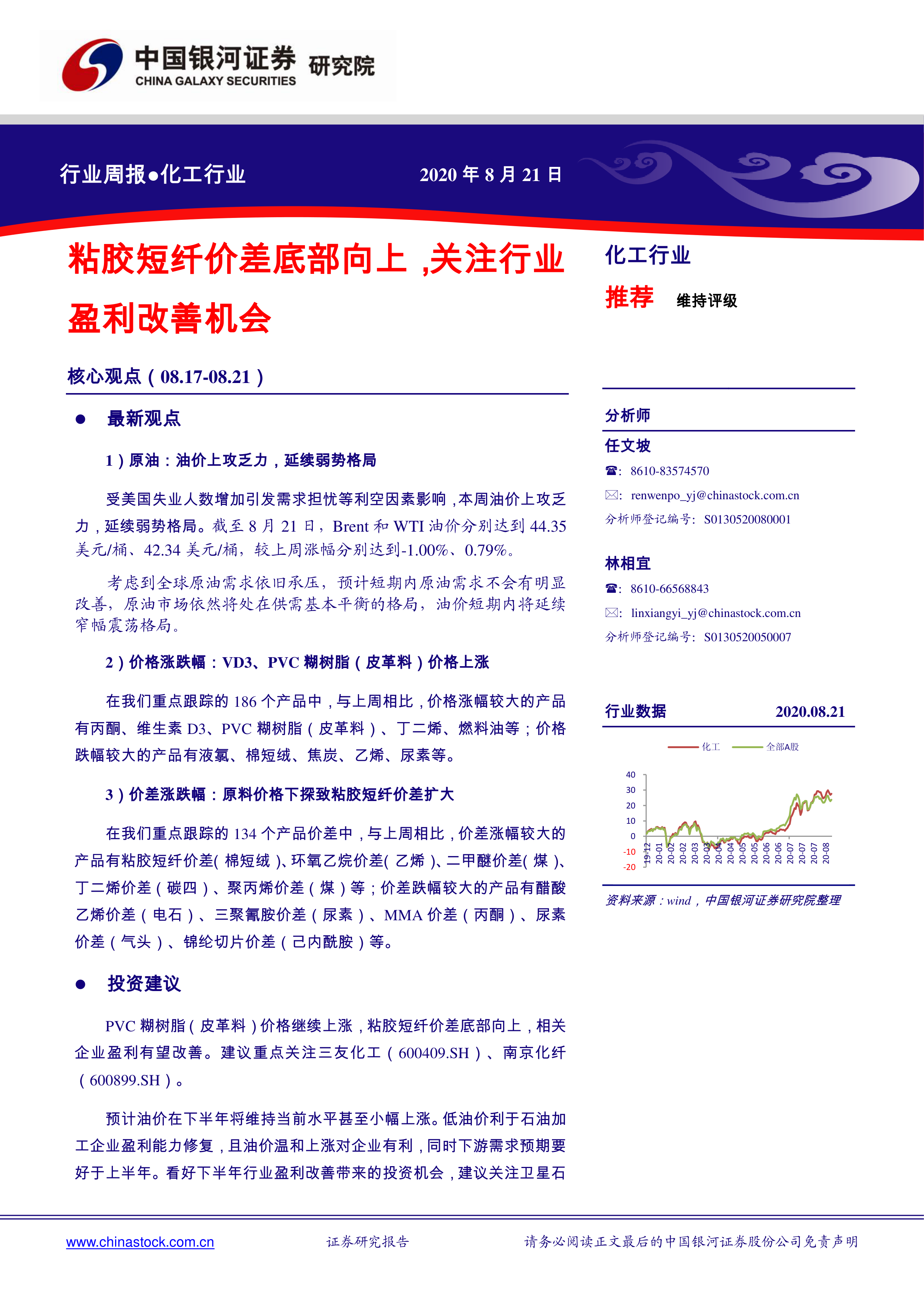 本报告主要分析了2020年8月21日化工行业的市场表现,重点关注了原油价格、各类化工产品价格及价差的变动情况,并对PVC糊树脂、粘胶短纤等产品的投资机会进行了分析。报告指出,原油价格短期内将维持窄幅震荡,但长期来看有望震荡上行。同时,报告建议关注PVC糊树脂(皮革料)价格上涨和粘胶短纤价差扩大的投资机会,并推荐了相关上市公司。