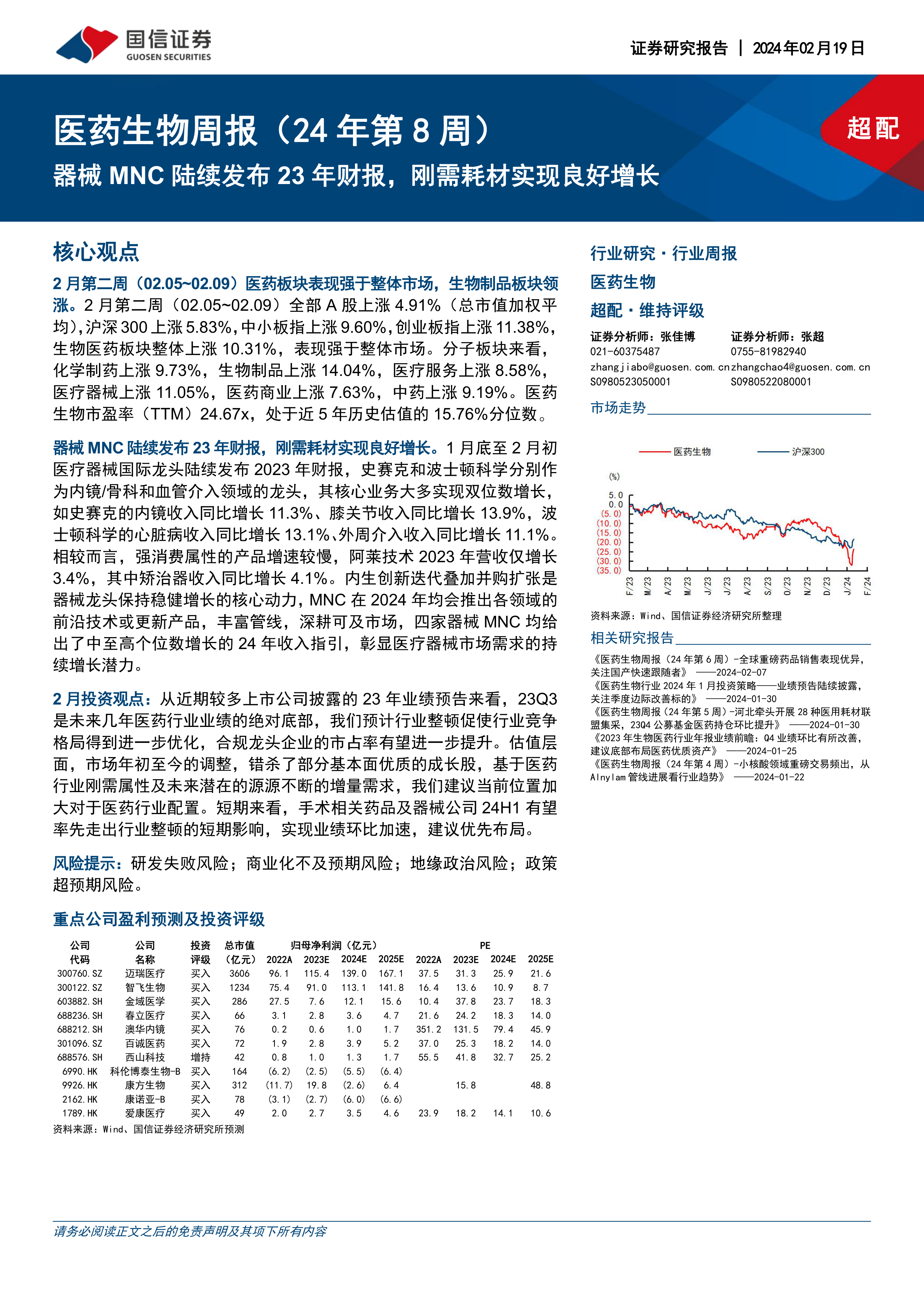 医药生物周报(24年第8周):器械MNC陆续发布23年财报,刚需耗材实现良好增长