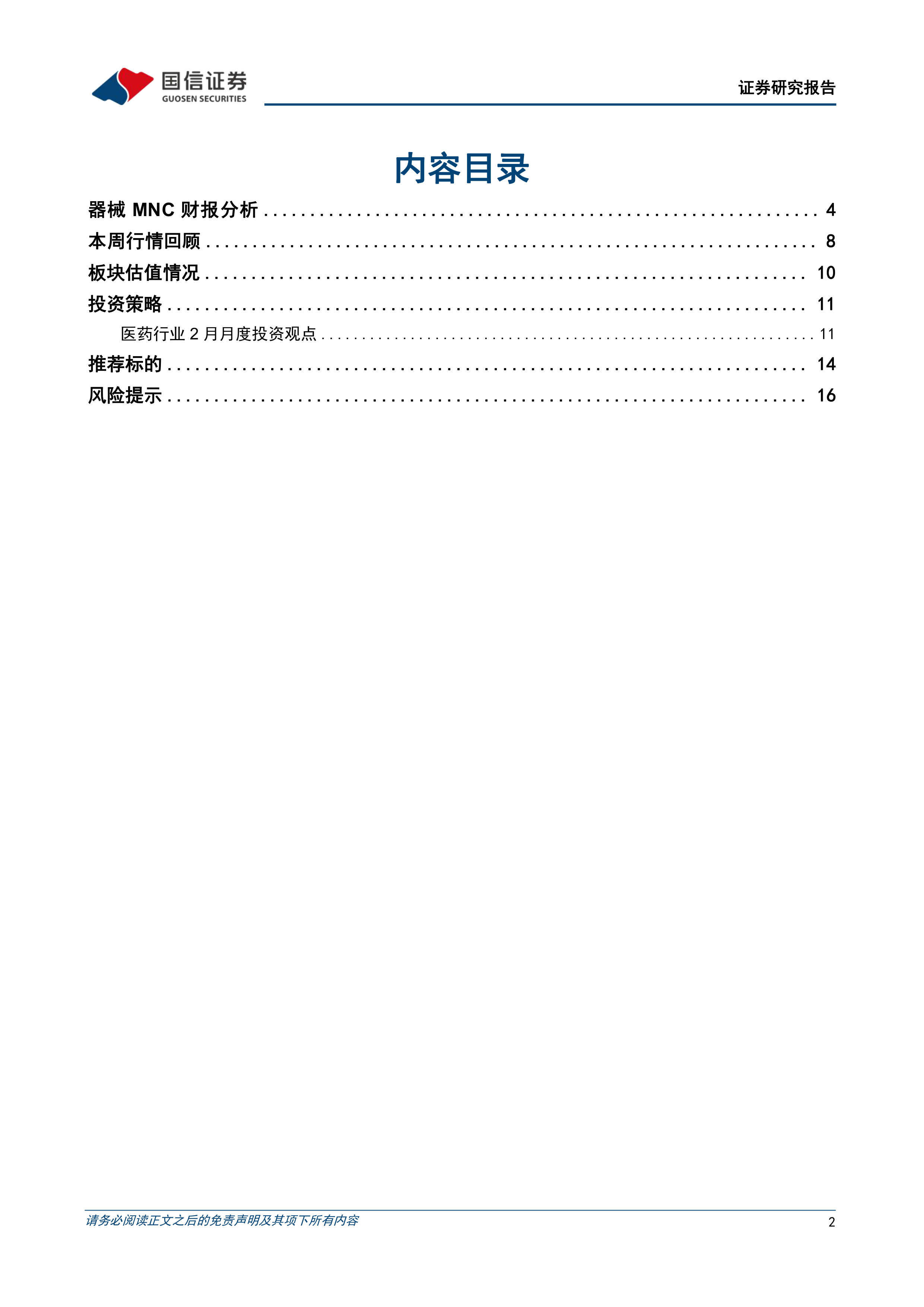 本报告深入分析了医疗器械巨头 2023 年财报,揭示了行业整体的稳健增长态势。同时,报告对生物医药板块的近期市场表现进行了回顾,并结合行业政策和市场环境,提出了 2 月份的投资策略。报告强调了创新药、创新医疗器械以及国际化公司的投资价值,并对细分领域进行了详细的投资分析和推荐。 投资者应关注报告中提及的风险提示,并结合自身情况进行投资决策。
