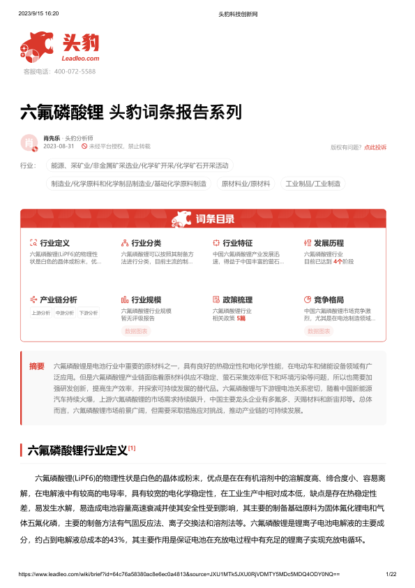 本报告深入分析了六氟磷酸锂行业的市场现状、产业链、竞争格局和政策环境。 随着新能源汽车市场的持续增长,六氟磷酸锂市场前景广阔。 中国企业在六氟磷酸锂生产领域占据主导地位,但仍面临原材料供应、技术创新等挑战。 政策支持和市场需求将共同推动行业发展,企业应积极布局全产业链,提升自身竞争力,以应对市场变化。