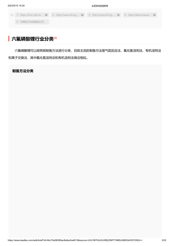 六氟磷酸锂(LiPF6)的物理性状是白色的晶体或粉末,优点是在在有机溶剂中的溶解度高、缔合度小、容易离解,在电解液中有较高的电导率,具有较宽的电化学稳定性,在工业生产中相对成本低,缺点是存在热稳定性差,易发生水解,易造成电池容量高速衰减并使其安全性受到影响,其主要的制备基础原料为固体氟化锂电和气体五氟化磷,主要的制备方法有气固反应法、离子交换法和溶剂法等。六氟磷酸锂是锂离子电池电解液的主要成分,约占到电解液总成本的43%,其主要作用是保证电池在充放电过程中有充足的锂离子实现充放电循环。