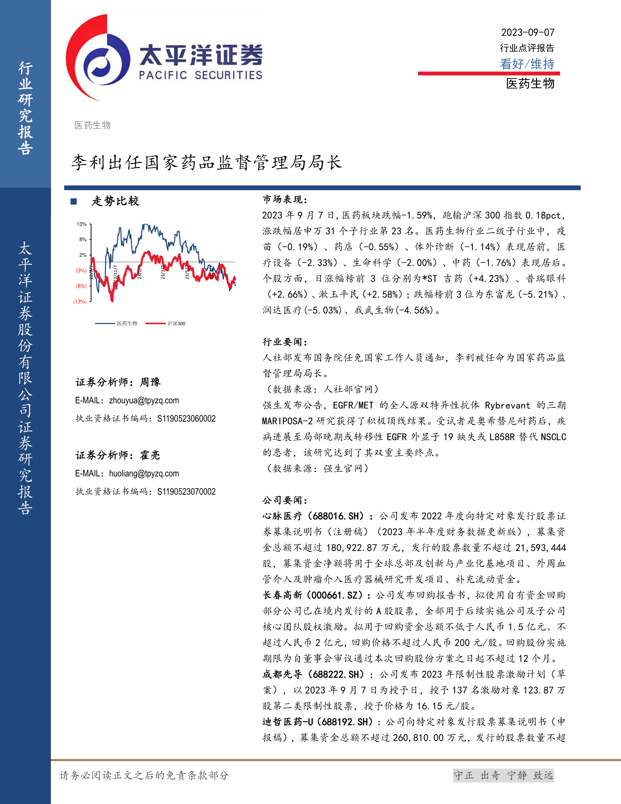 本报告的核心观点聚焦于2023年9月7日医药生物行业的市场表现、重要行业动态以及相关公司公告。报告指出,当日医药板块整体表现不佳,但部分细分领域表现突出。同时,国家药品监督管理局局长的人事变动以及强生公司新药研发的积极进展,为行业带来了新的关注点。此外,多家上市公司发布了定向增发、回购、股权激励等公告,反映了行业内公司对未来发展的不同策略。
