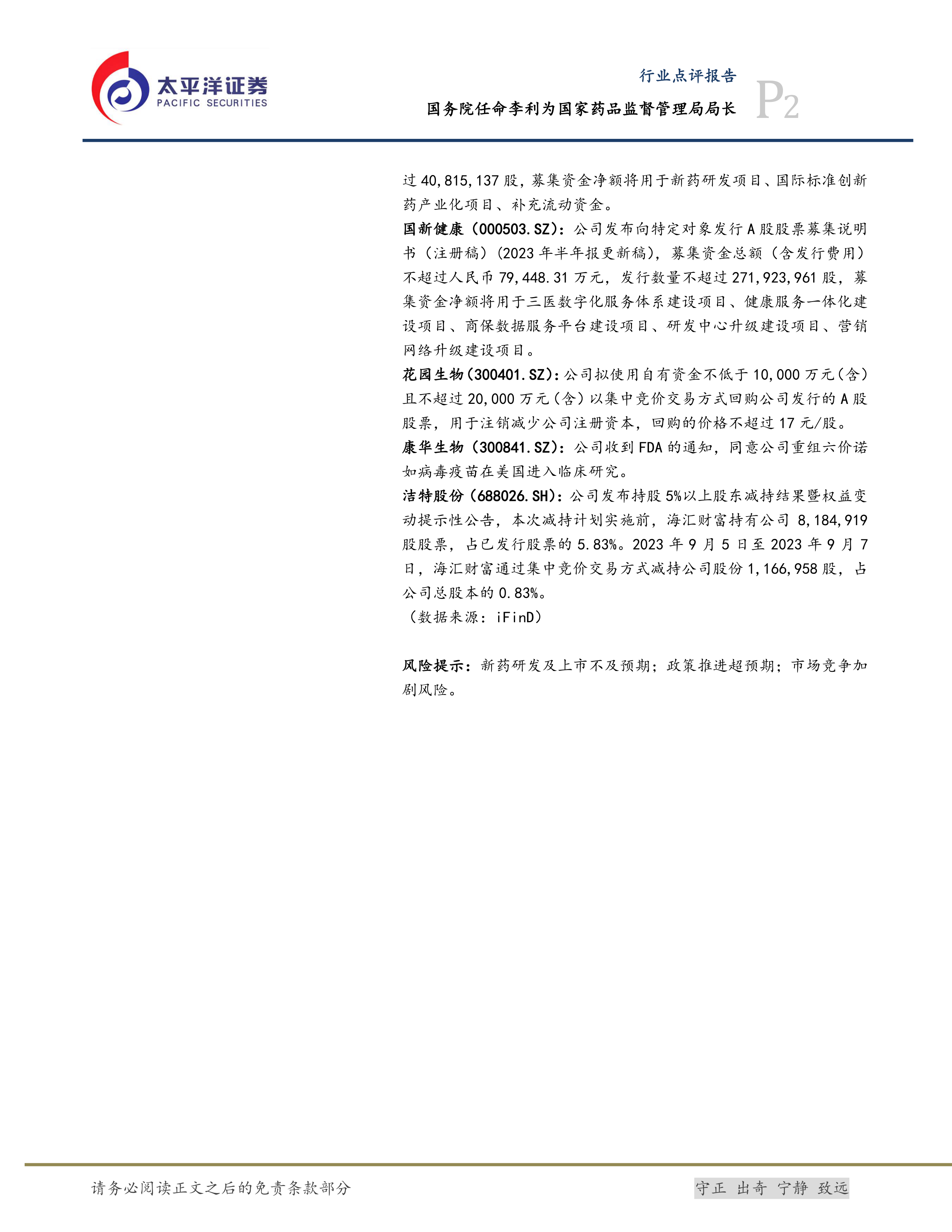 本报告分析了2023年9月7日医药生物行业的市场表现,指出当日板块整体下跌,但部分细分领域表现较好。报告还重点关注了行业内的人事变动、公司公告以及研发进展。国家药品监督管理局局长的人事任命以及强生公司新药研发的积极进展,为行业带来了新的关注点。多家上市公司发布的定向增发、回购、股权激励等公告,反映了行业内公司对未来发展的不同策略。