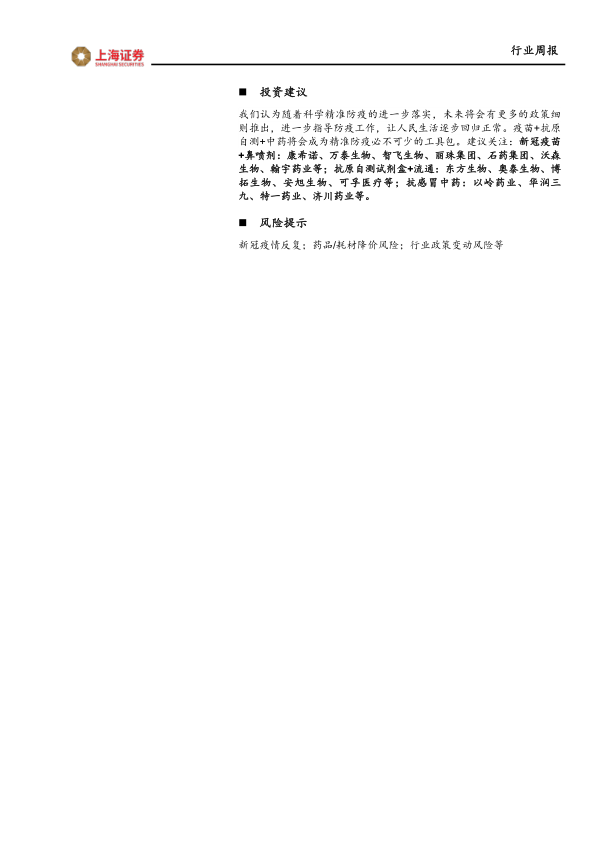 我们认为随着科学精准防疫的进一步落实,未来将会有更多的政策细则推出,进一步指导防疫工作,让人民生活逐步回归正常。疫苗+抗原自测+中药将会成为精准防疫必不可少的工具包。建议关注: 新冠疫苗+鼻喷剂:康希诺、万泰生物、智飞生物、丽珠集团、石药集团、沃森生物、翰宇药业等;抗原自测试剂盒+流通:东方生物、奥泰生物、博拓生物、安旭生物、可孚医疗等;抗感冒中药:以岭药业、华润三九、特一药业、济川药业等。