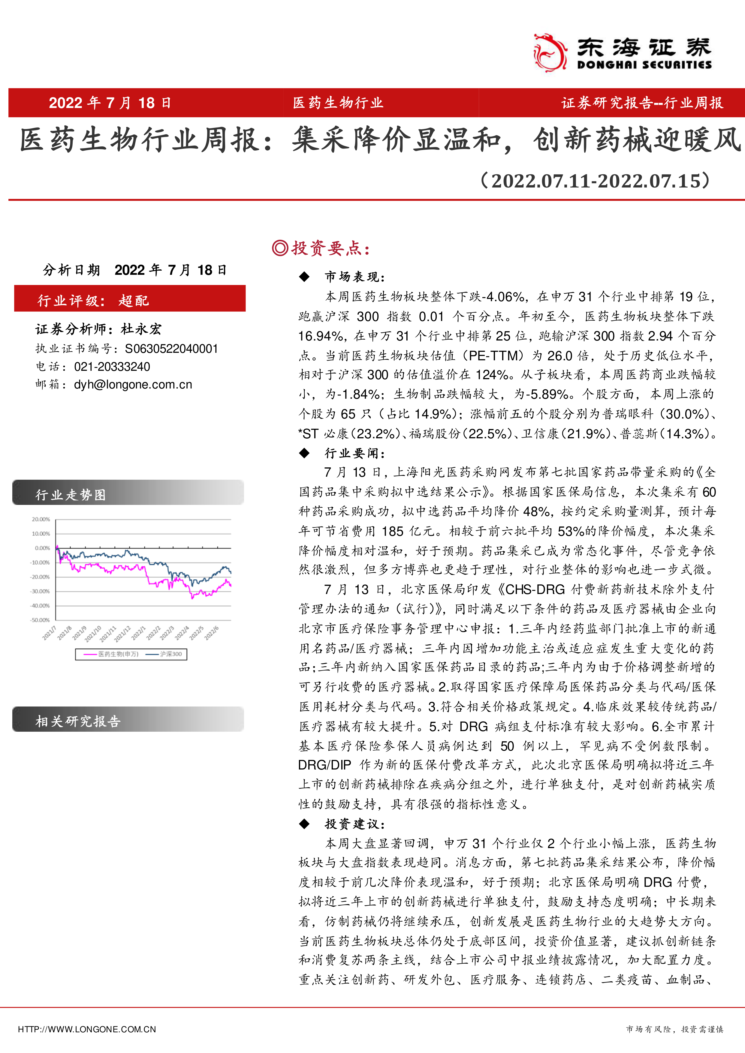 7 月 13 日,上海阳光医药采购网发布第七批国家药品带量采购的 《全国药品集中采购拟中选结果公示》。根据国家医保局信息,本次集采有 60种药品采购成功,拟中选药品平均降价 48%,按约定采购量测算,预计每年可节省费用 185 亿元。相较于前六批平均 53%的降价幅度,本次集采降价幅度相对温和,好于预期。药品集采已成为常态化事件,尽管竞争依然很激烈,但多方博弈也更趋于理性,对行业整体的影响也进一步式微。7 月 13 日,北京医保局印发《CHS-DRG 付费新药新技术除外支付管理办法的通知(试行)》 ,同时满足以下条件的药品及医疗器械由企业向北京市医疗保险事务管理中心申报:1.三年内经药监部门批准上市的新通用名药品/医疗器械;三年内因增加功能主治或适应症发生重大变化的药品;三年内新纳入国家医保药品目录的药品;三年内为由于价格调整新增的可另行收费的医疗器械。 2.取得国家医疗保障局医保药品分类与代码/医保医用耗材分类与代码。3.符合相关价格政策规定。4.临床效果较传统药品/医疗器械有较大提升。5.对 DRG 病组支付标准有较大影响。6.全市累计基本医疗保险参保人员病例达到 50 例以上,罕见病不受例数限制。DRG/DIP 作为新的医保付费改革方式,此次北京医保局明确拟将近三年上市的创新药械排除在疾病分组之外,进行单独支付,是对创新药械实质性的鼓励支持,具有很强的指标性意义。