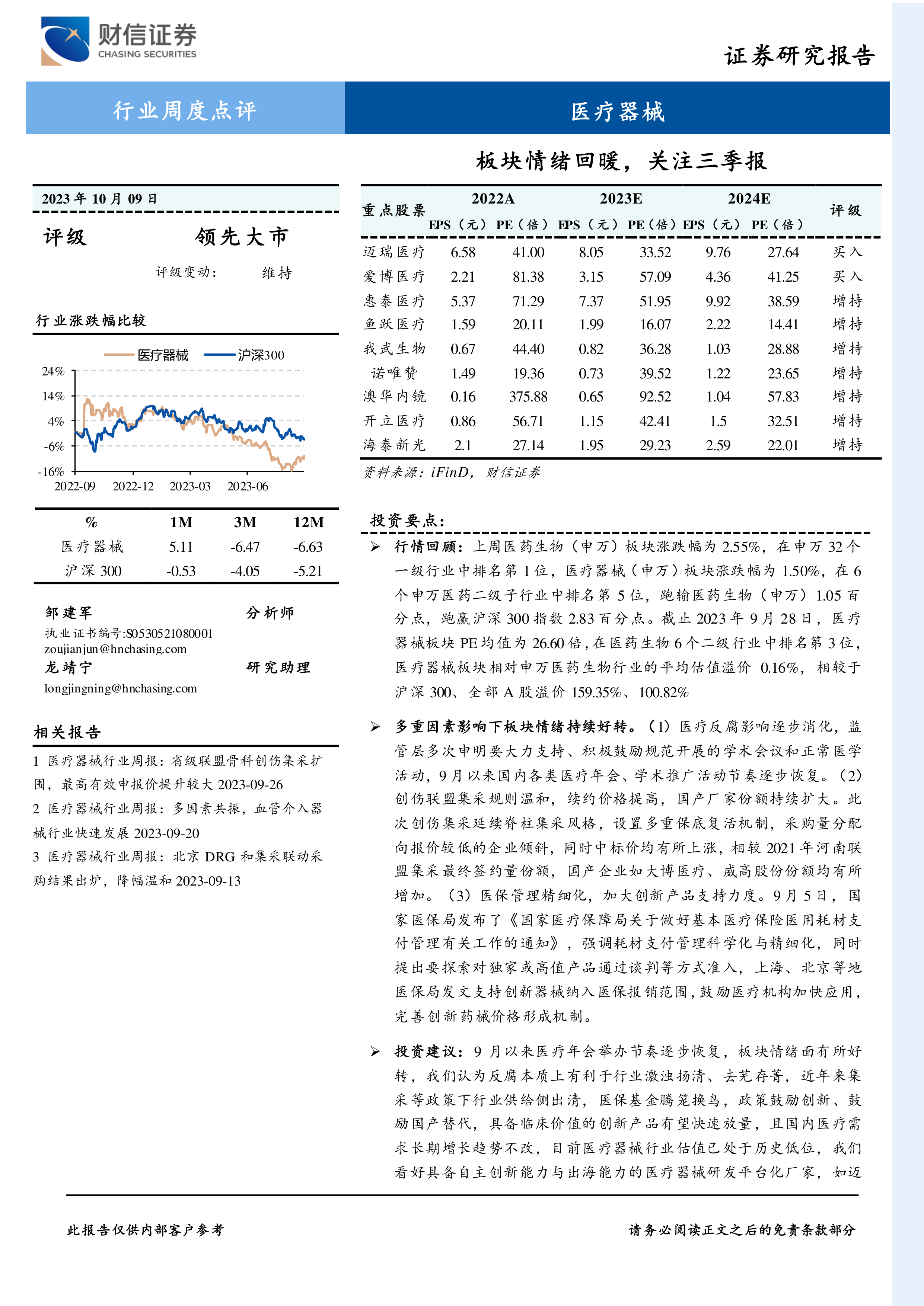 行情回顾: 上周医药生物(申万)板块涨跌幅为 2.55%,在申万 32 个一级行业中排名第 1 位,医疗器械(申万)板块涨跌幅为 1.50%,在 6个申万医药二级子行业中排名第 5 位, 跑输医药生物(申万) 1.05 百分点,跑赢沪深 300 指数 2.83 百分点。 截止 2023 年 9 月 28 日,医疗器械板块 PE均值为 26.60 倍,在医药生物 6 个二级行业中排名第 3 位,医疗器械板块相对申万医药生物行业的平均估值溢价 0.16%,相较于沪深 300、全部 A 股溢价 159.35%、 100.82%