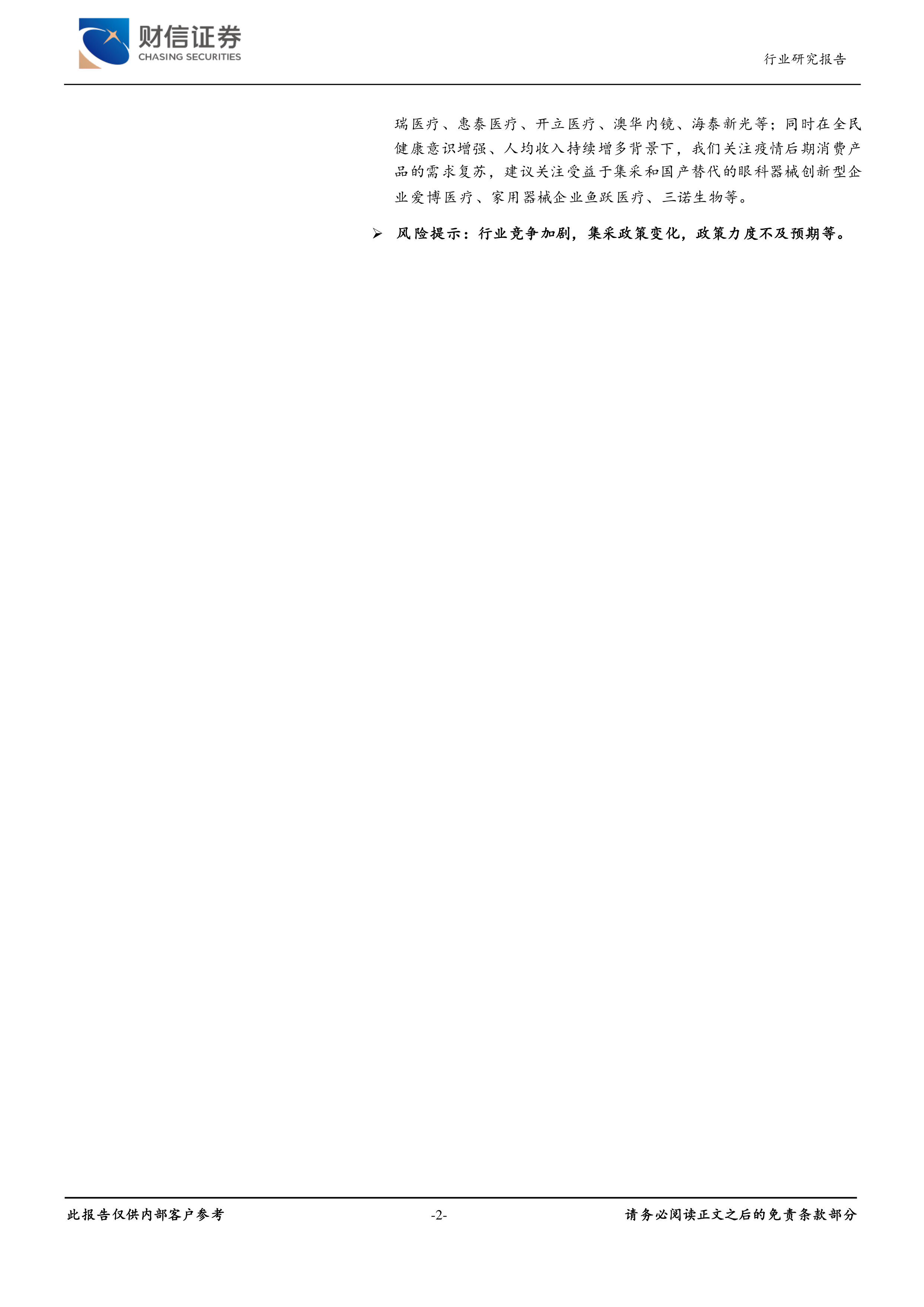 投资建议: 9 月以来医疗年会举办节奏逐步恢复,板块情绪面有所好转,我们认为反腐本质上有利于行业激浊扬清、去芜存菁,近年来集采等政策下行业供给侧出清,医保基金腾笼换鸟,政策鼓励创新、鼓励国产替代,具备临床价值的创新产品有望快速放量,且国内医疗需求长期增长趋势不改,目前医疗器械行业估值已处于历史低位,我们看好具备自主创新能力与出海能力的医疗器械研发平台化厂家,如迈瑞医疗、惠泰医疗、开立医疗、澳华内镜、海泰新光等;同时在全民健康意识增强、人均收入持续增多背景下,我们关注疫情后期消费产品的需求复苏,建议关注受益于集采和国产替代的眼科器械创新型企业爱博医疗、家用器械企业鱼跃医疗、三诺生物等。