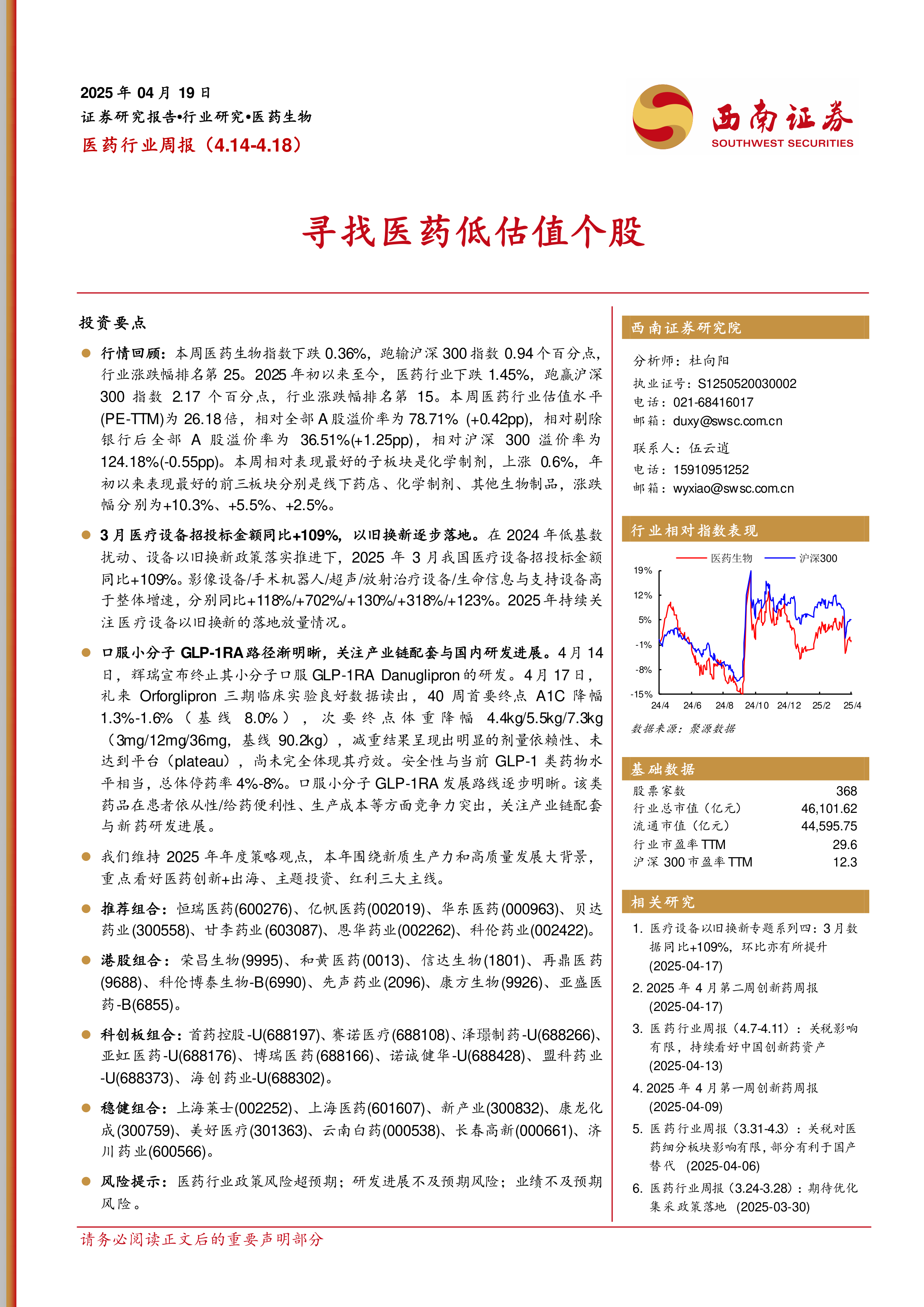 本周医药行业整体表现略有下跌,但年初至今仍跑赢大盘。医疗设备以旧换新和口服小分子 GLP-1RA 领域值得关注。维持对医药创新+出海、主题投资、红利三大主线的看好,并提示了相关风险。