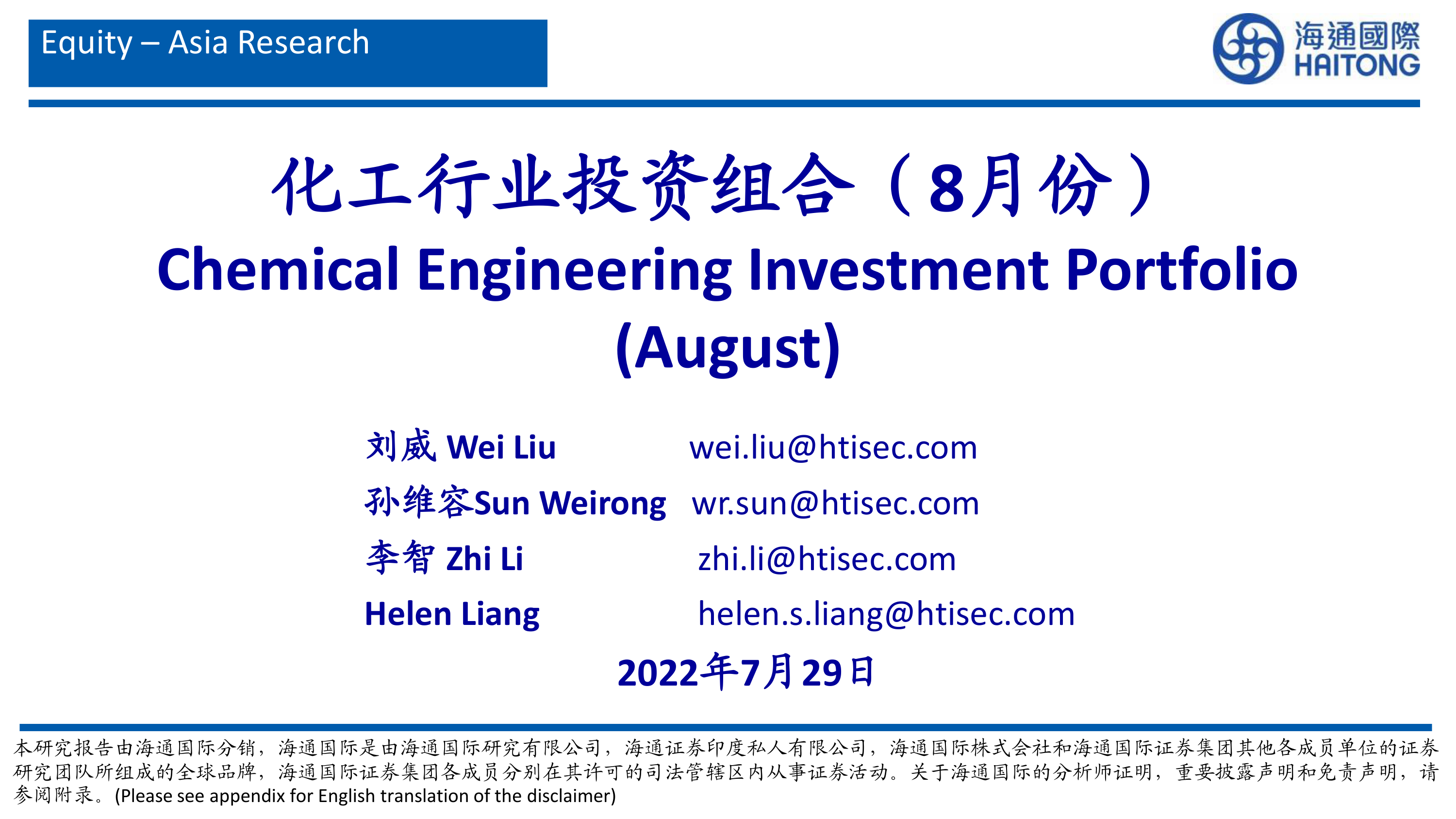 本报告分析了2022年7月化工行业的市场表现,并基于此提供了8月份的投资组合建议。报告重点关注了石化和基础化工领域的投资机会,并对相关公司的盈利进行了预测。报告也强调了行业面临的风险,为投资者提供了全面的分析视角。