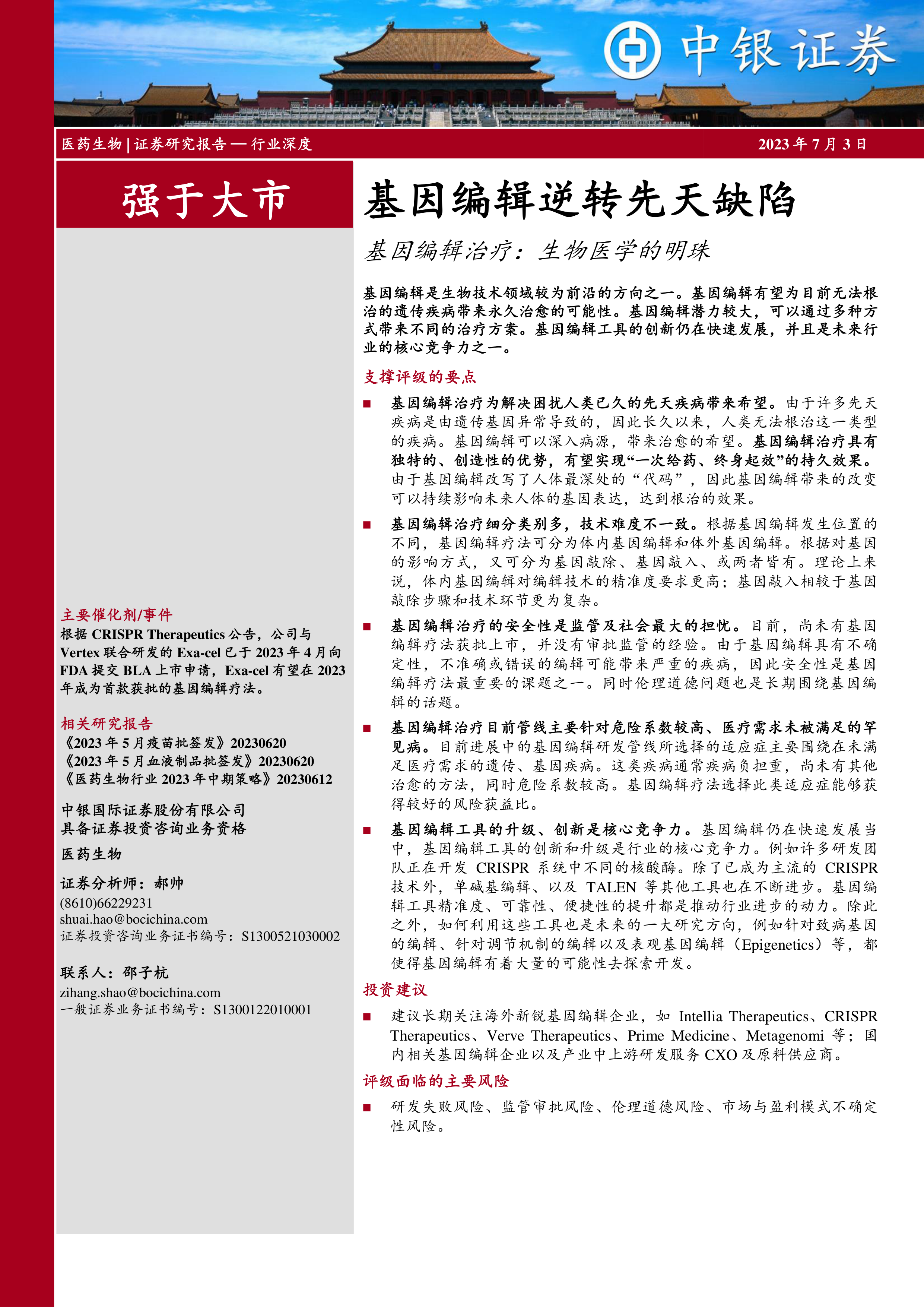 建议长期关注海外新锐基因编辑企业,如IntelliaTherapeutics、CRISPRTherapeutics、VerveTherapeutics、PrimeMedicine、Metagenomi等;国内相关基因编辑企业以及产业中上游研发服务CXO及原料供应商。