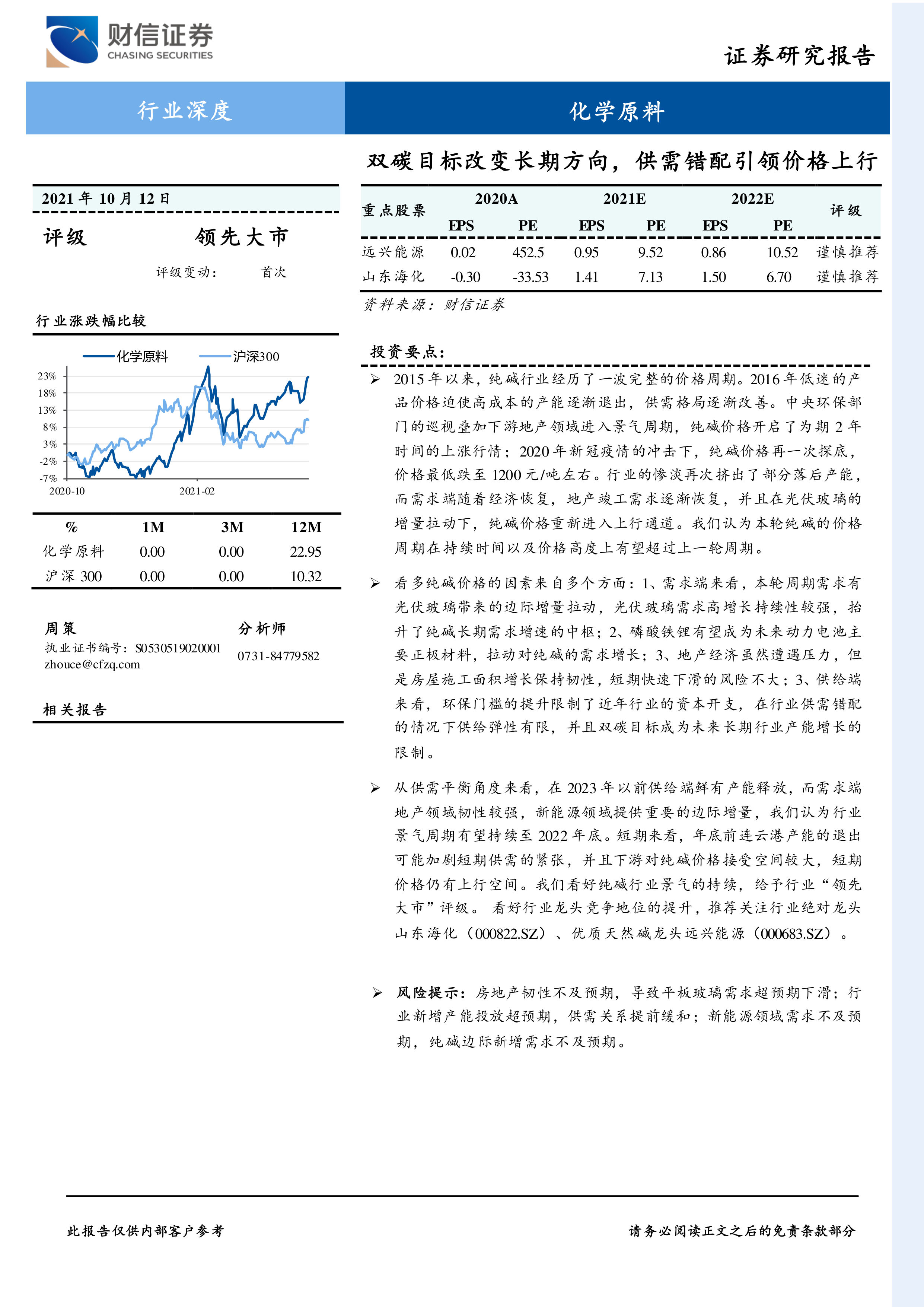从供需平衡角度来看,在2023年以前供给端鲜有产能释放,而需求端地产领域韧性较强,新能源领域提供重要的边际增量,我们认为行业景气周期有望持续至2022年底。短期来看,年底前连云港产能的退出可能加剧短期供需的紧张,并且下游对纯碱价格接受空间较大,短期价格仍有上行空间。我们看好纯碱行业景气的持续,给予行业“领先大市”评级。看好行业龙头竞争地位的提升,推荐关注行业绝对龙头山东海化(000822.SZ)、优质天然碱龙头远兴能源(000683.SZ)。